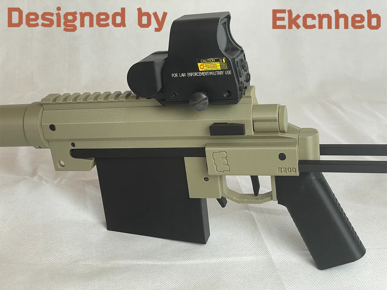 Cái tên “E200” là một cách chơi chữ từ dòng súng M200 Intervention của công ty CheyTac, vì đó là mẫu mà mình đã dựa vào để thiết kế vẻ ngoài. Chữ “E” trong “E200” tất nhiên là viết tắt của Ekcnheb rồi.