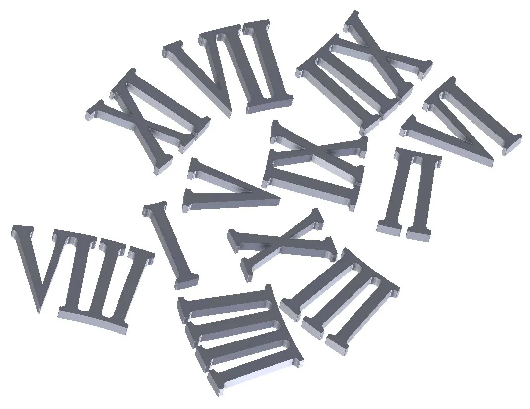 Bạn đang thực hiện một dự án chế tác đồng hồ treo tường và muốn tìm kiếm những chi tiết trang trí cổ điển? Hãy tải ngay bộ file 3D chữ số La Mã (Roman numbers) từ I đến XII này. Sản phẩm được thiết kế tối ưu cho việc in 3D, với độ chi tiết cao và kiểu dáng thanh thoát, phù hợp để tạo nên vẻ sang trọng, hoài cổ cho mọi chiếc đồng hồ tự làm. Dễ dàng in ấn bằng chất liệu PLA mà không cần support, giúp bạn tiết kiệm thời gian hậu kỳ. Bộ số này cực kỳ linh hoạt, cho phép bạn tùy chỉnh kích thước và màu sắc tùy thích để phù hợp với phong cách trang trí nội thất của ngôi nhà bạn, mang đến sự hoàn hảo cho sản phẩm sáng tạo của riêng mình.