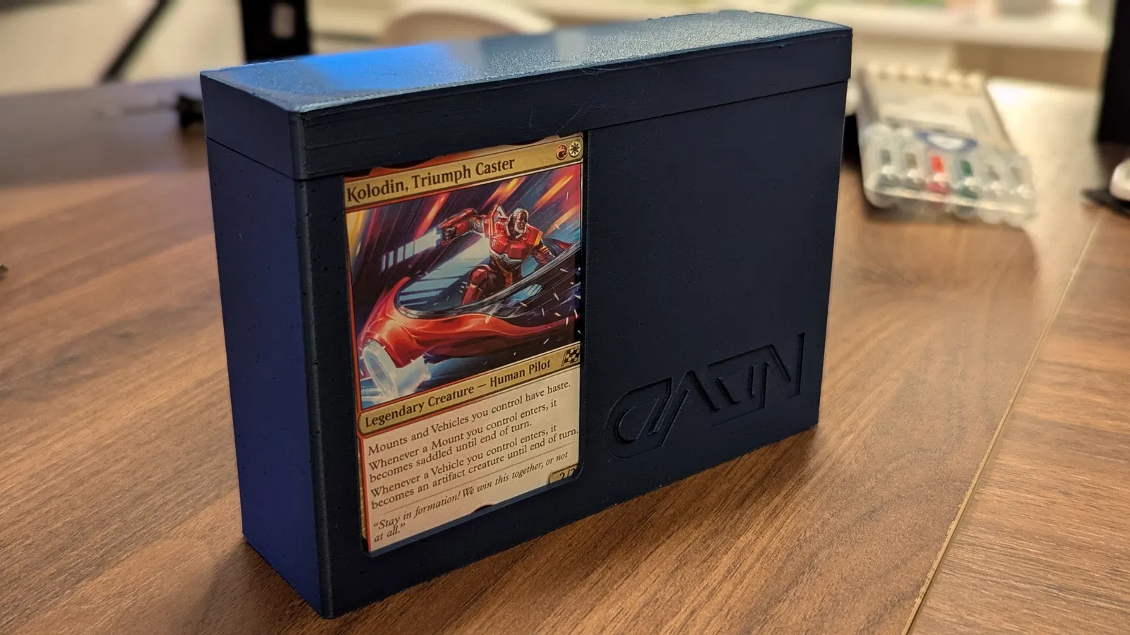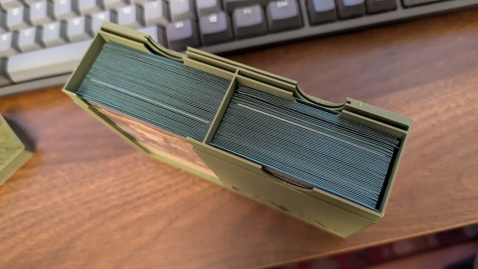 Hộp có không gian chứa một bộ bài Commander bọc sleeve (hoặc hai bộ 40 lá thoải mái; không vừa 60 lá mỗi bên) và một vài khe để đựng token.