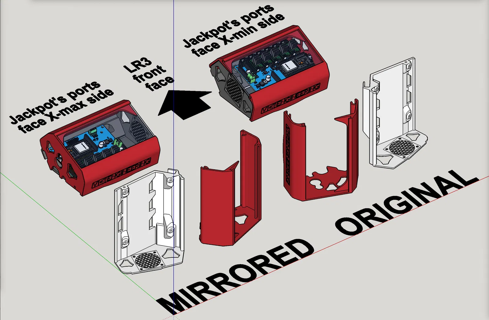 Mình đã thực hiện một vài cải tiến như: không cần mài góc như bản gốc của @Tokoloshe, tạo thêm phiên bản đối xứng (mirrored) cho các cổng kết nối nằm ở phía X-max, và nới rộng phần treo (hanger) thêm 1.5mm để vừa với thanh gỗ dán 1/4" của mình.