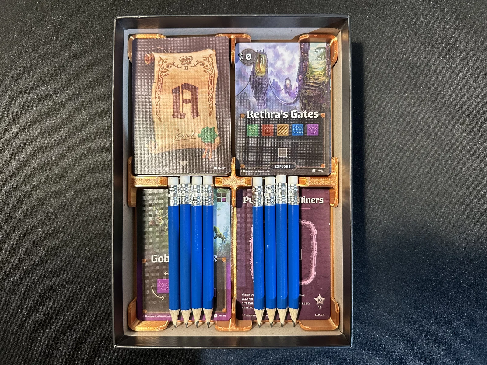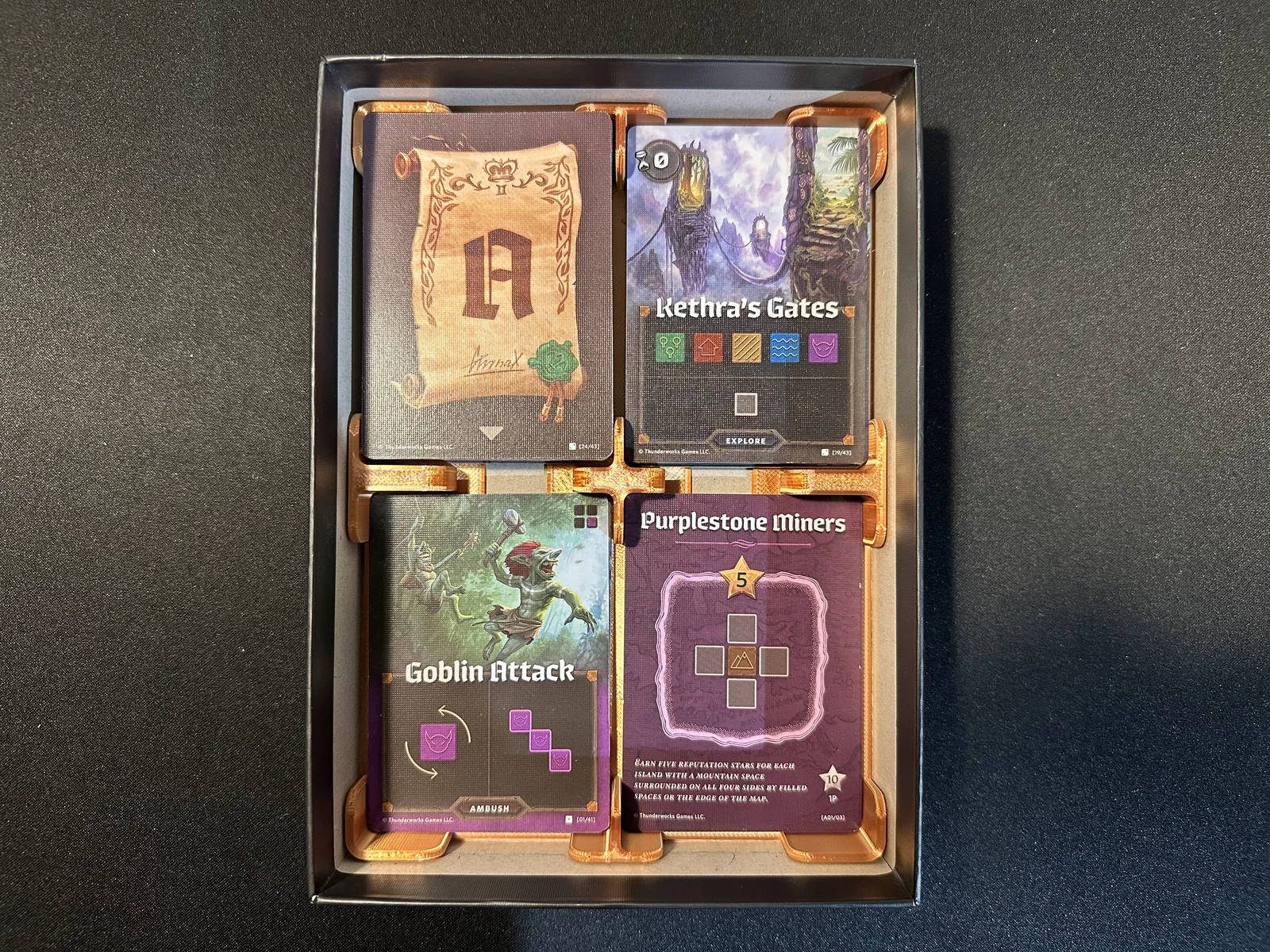 Khay được chia làm bốn ngăn chính: thẻ tính điểm, thẻ khám phá (Explore), thẻ quái vật/anh hùng và một ngăn riêng cho các thẻ mở rộng.