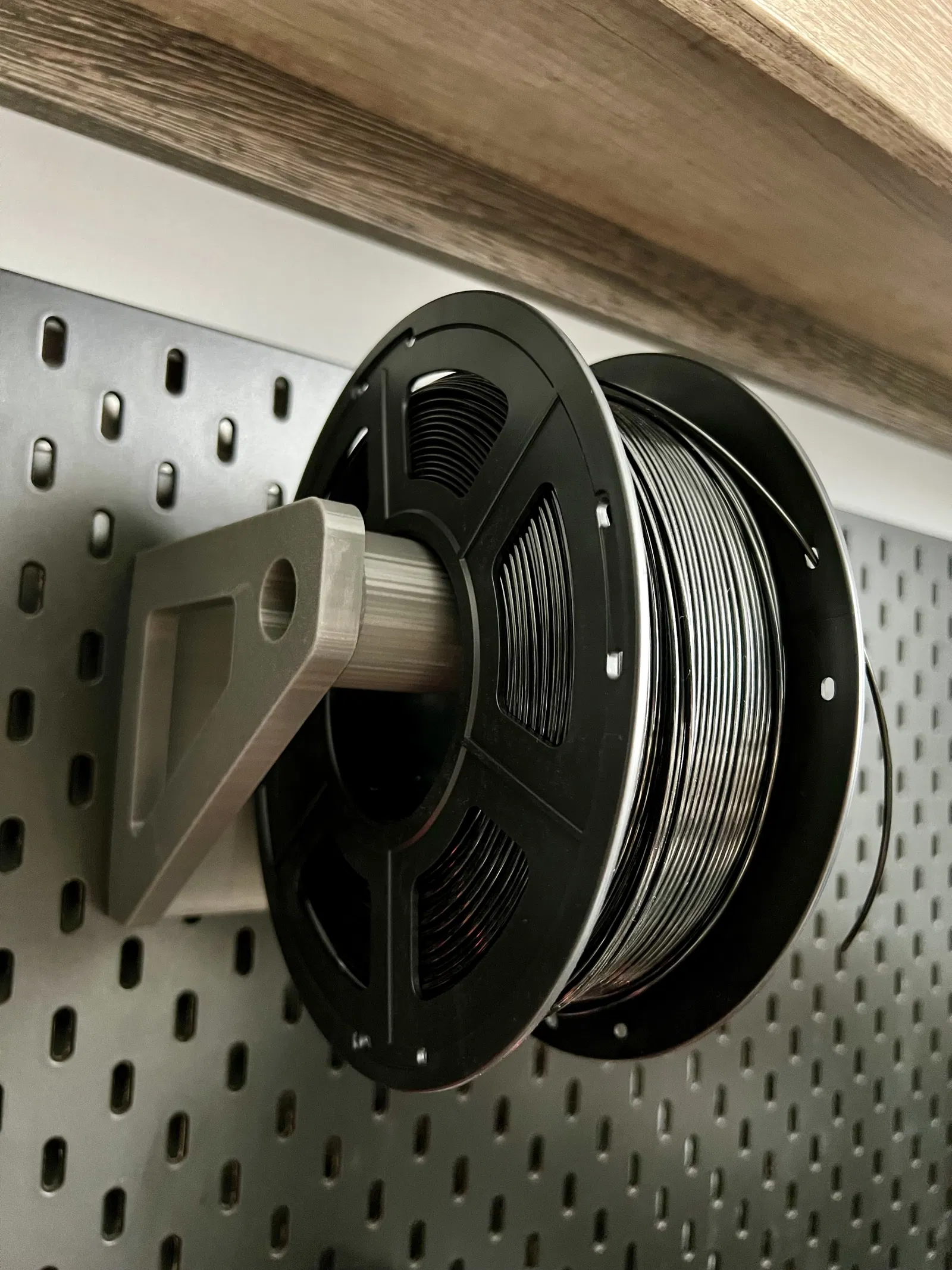 Nếu bạn đang dùng hệ thống Skadis để treo các phụ kiện máy in 3D, thì đây là cách tuyệt vời để cất giữ cuộn nhựa, đồng thời có thể dùng làm giá đỡ để xả nhựa trực tiếp khi in.