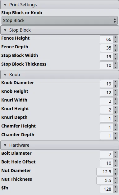 Đây là mẫu stop block (cữ chặn) có thể tùy chỉnh thông số cho các loại rãnh T-track. Các cài đặt mặc định được thiết kế cho Kreg Trak, sử dụng bu-lông 1/4", với kích thước cao 2-5/8" (66mm) và rộng 1-3/8" (35mm).