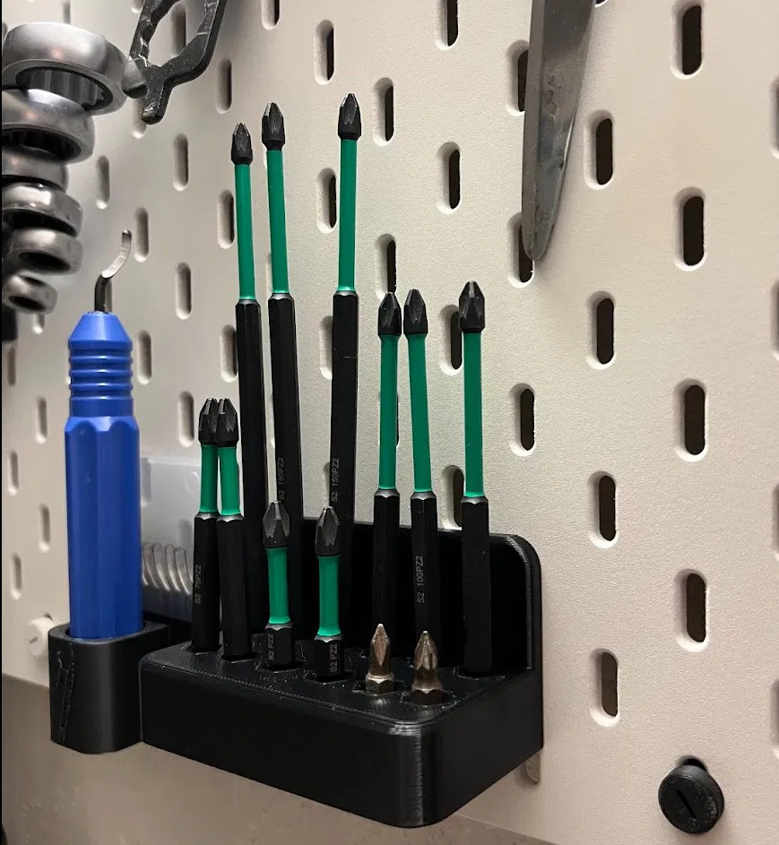 Bạn là người yêu thích sự ngăn nắp trong góc làm việc hoặc xưởng DIY tại nhà? Nếu bạn đang sở hữu một tấm bảng treo Ikea Skadis, thì món phụ kiện in 3D này chính là giải pháp hoàn hảo để quản lý đống đầu vít lục giác (hex bit) lộn xộn của mình. Thay vì để các đầu vít nằm lung tung trong hộp đồ nghề, bạn có thể tận dụng ngay không gian trên tường để biến chúng thành một bộ sưu tập cực kỳ chuyên nghiệp và dễ tìm kiếm.