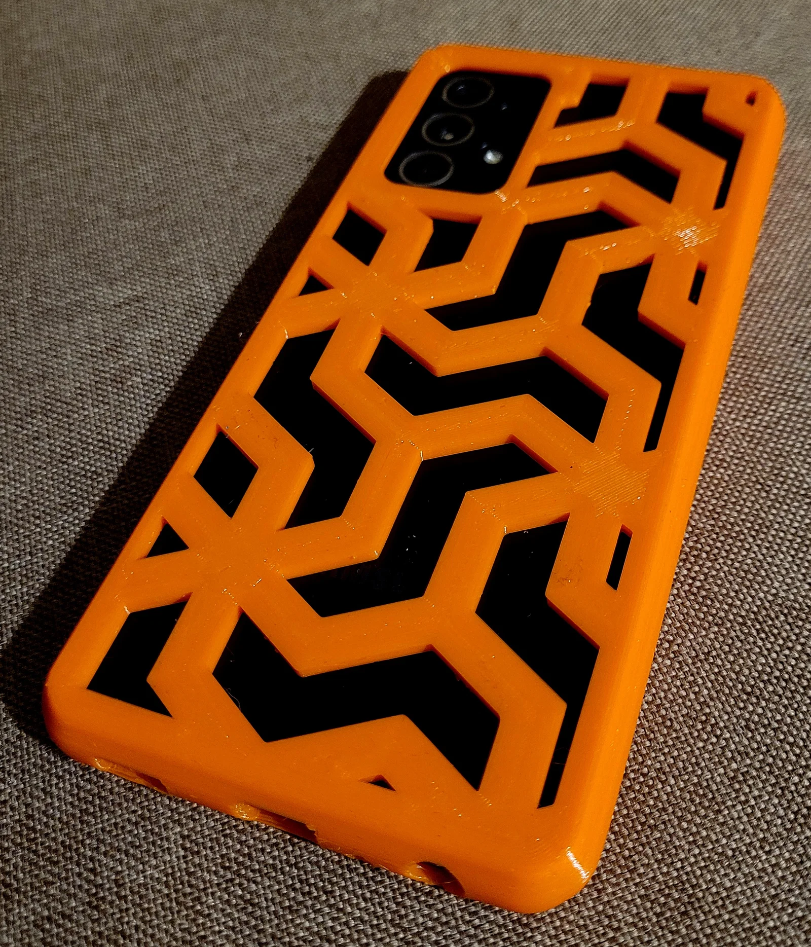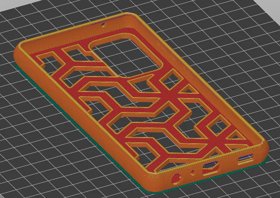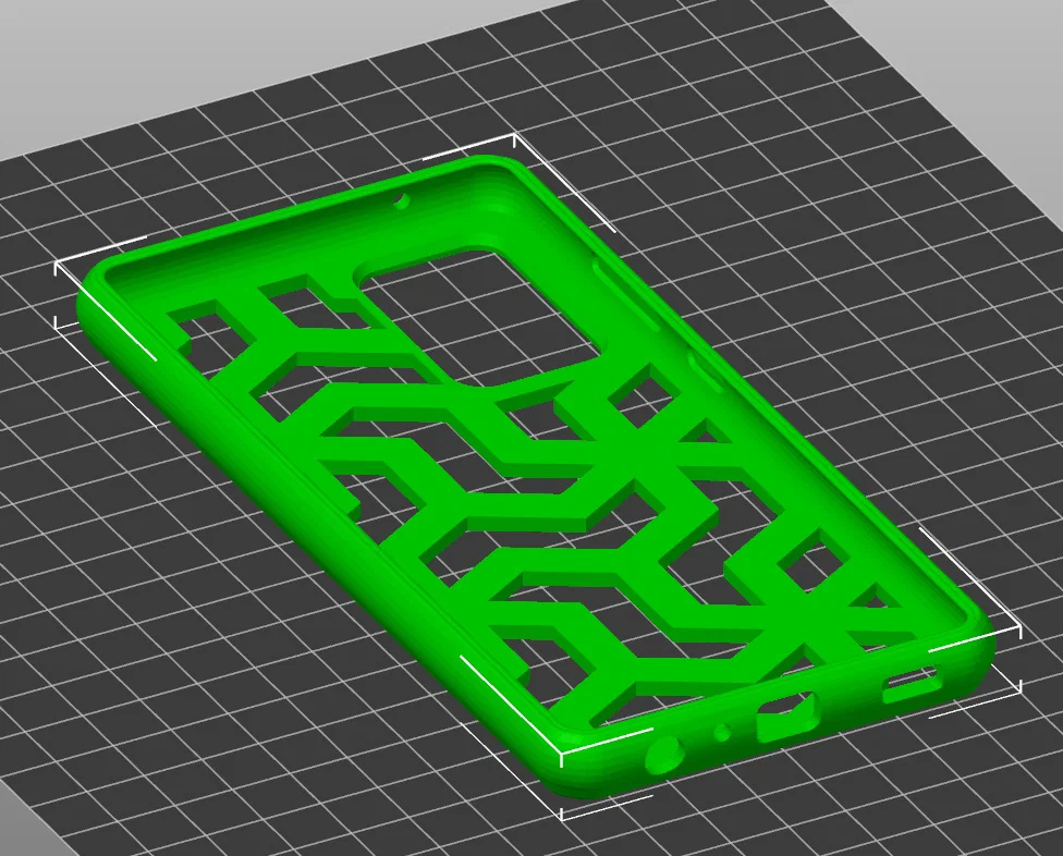 Mẫu ốp lưng bumper cho Samsung Galaxy A52 5G với họa tiết hình học, độ dày 2.6mm. Thiết kế chuẩn xác cho cổng kết nối và nút bấm. Khuyên dùng nhựa TPU với tốc độ in chậm từ 18-22 mm/s để đạt kết quả tốt nhất.
