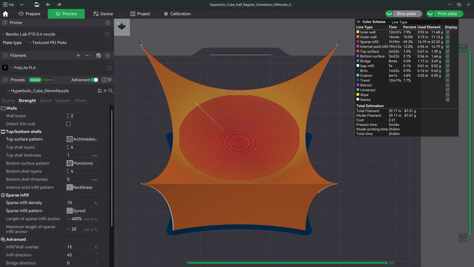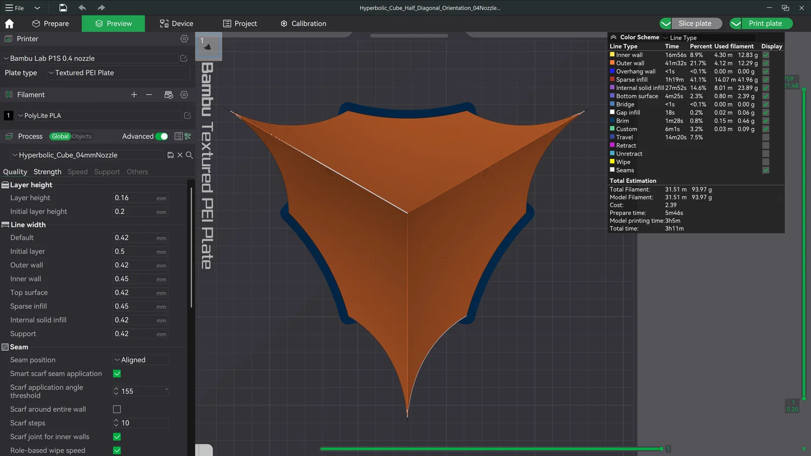 Lưu ý quan trọng: Công nghệ in FDM có những hạn chế nhất định với hình dạng này do đặc thù của hình học hyperbolic. Các đầu nhọn có thể sẽ không được in ra hoàn hảo, nhưng bạn có thể cải thiện kết quả bằng cách điều chỉnh tốc độ in về cuối và thử nghiệm các hướng đặt mô hình khác nhau. (Tôi đã đính kèm các file 3MF cho một vài hướng in mà tôi đã thử nghiệm).