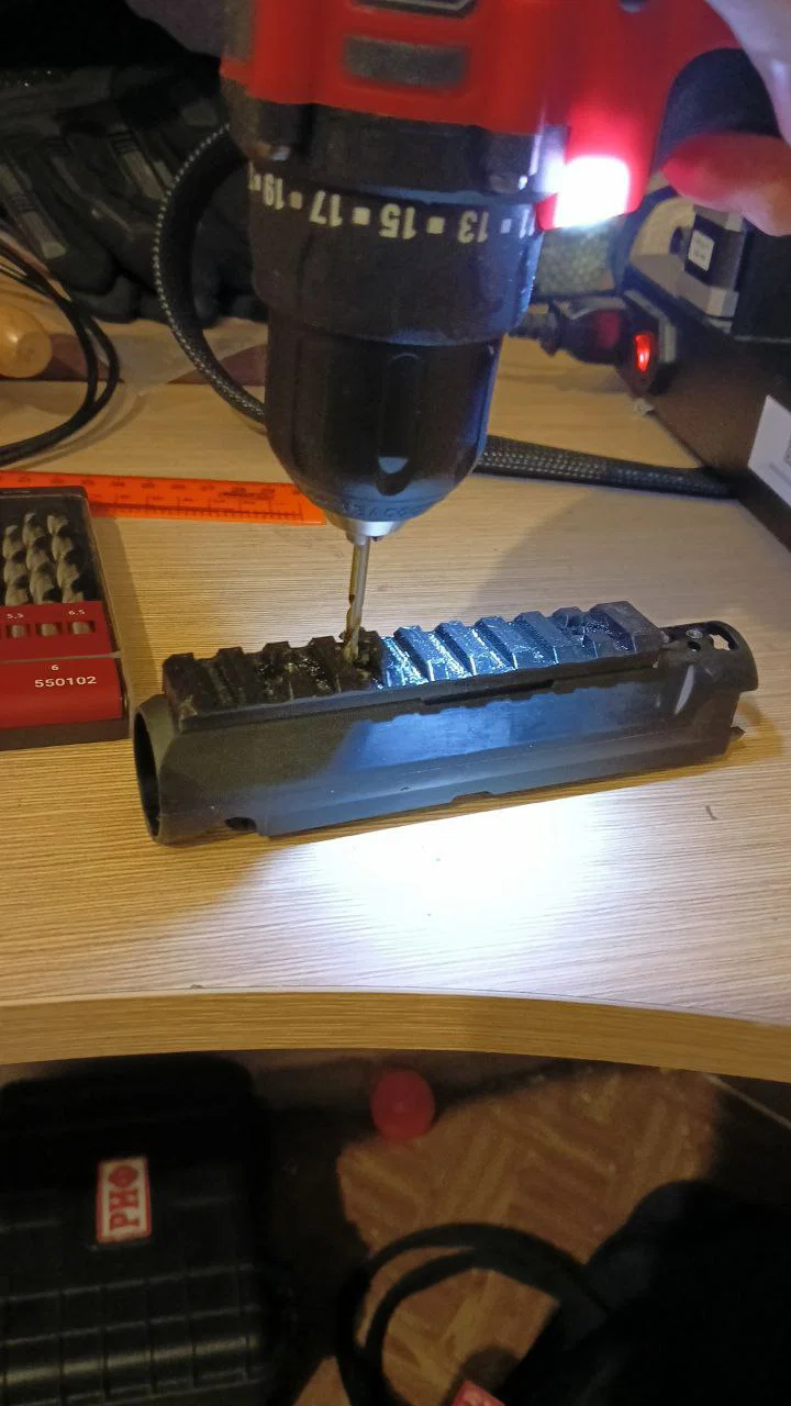• Khoan lỗ trên thanh picatinny rail ở phần trên.