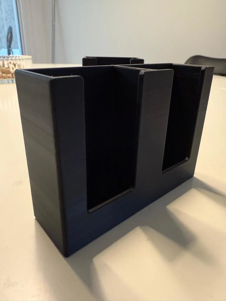 Mình đã tinh chỉnh mẫu thiết kế gốc từ 3 ngăn xuống còn 2 ngăn để đựng remote cho gọn gàng hơn. Thiết kế này rất dễ in, không cần hỗ trợ (supports) và cực kỳ tiện lợi để gắn lên tường giúp không gian sống ngăn nắp.