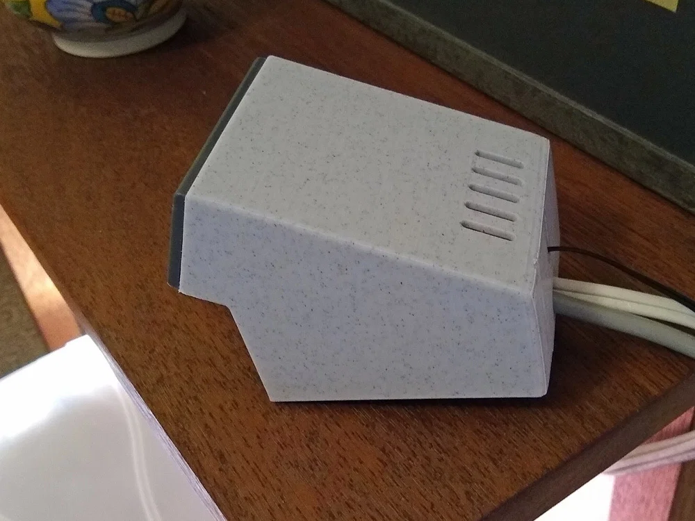 Sau khi in xong, bạn hãy luồn dây cảm biến qua lỗ ở mặt sau của hộp, sau đó luồn dây nguồn và dây thiết bị vào cùng lỗ đó. Thực hiện các bước đấu nối dây điện. Bạn có thể bỏ các thanh kẹp trượt ở hai bên đi vì không cần dùng đến chúng. Chỉ cần trượt bộ điều khiển vào trong hộp. Nó sẽ vừa khít và cố định chắc chắn. Nếu cần, bạn có thể thắt một dây rút nhựa quanh bó dây bên trong trước khi nhét vào hộp để giảm tải cho dây, và thêm một dây rút nữa ở phía ngoài để tránh dây bị tuột ra ngoài.