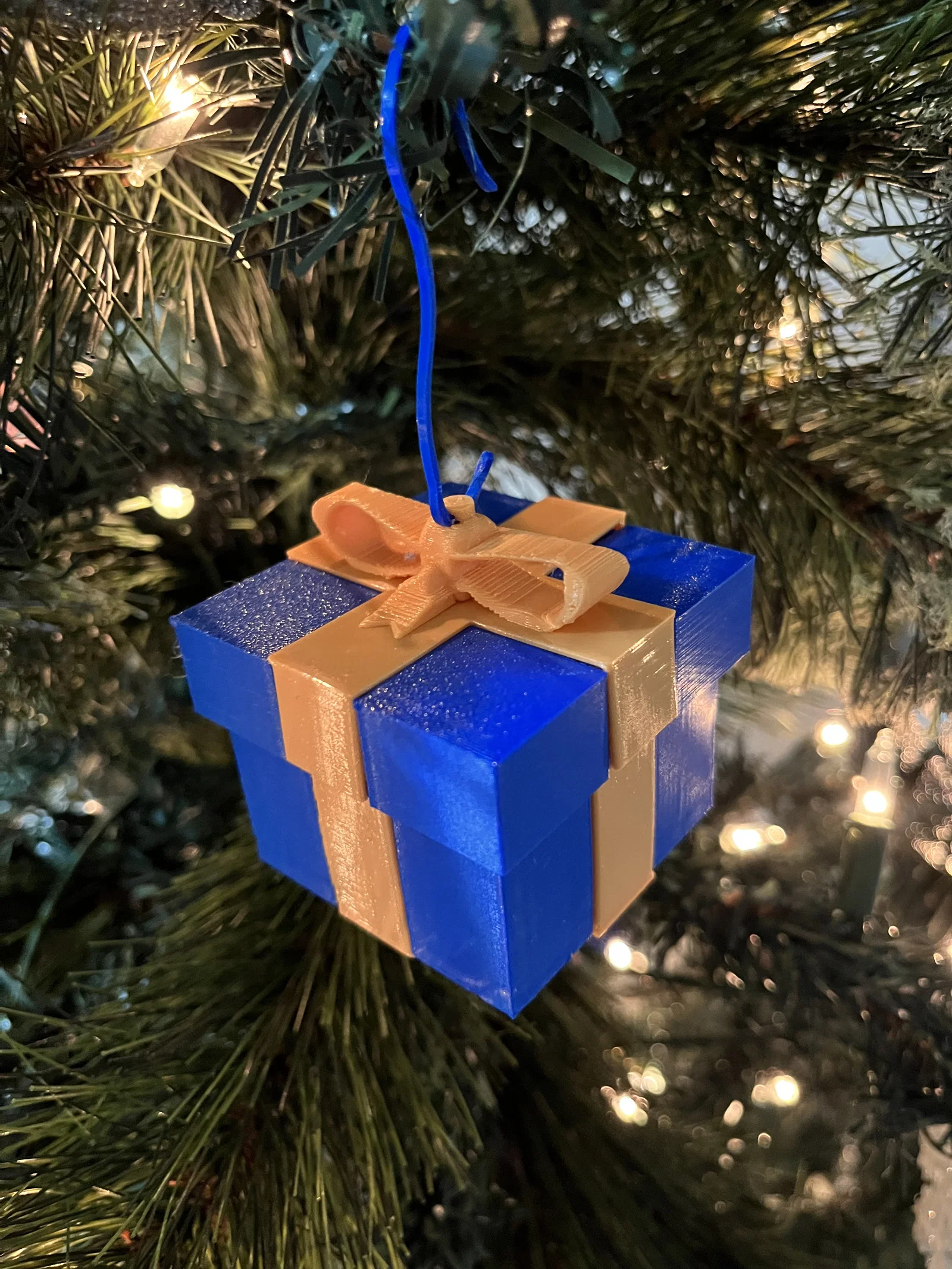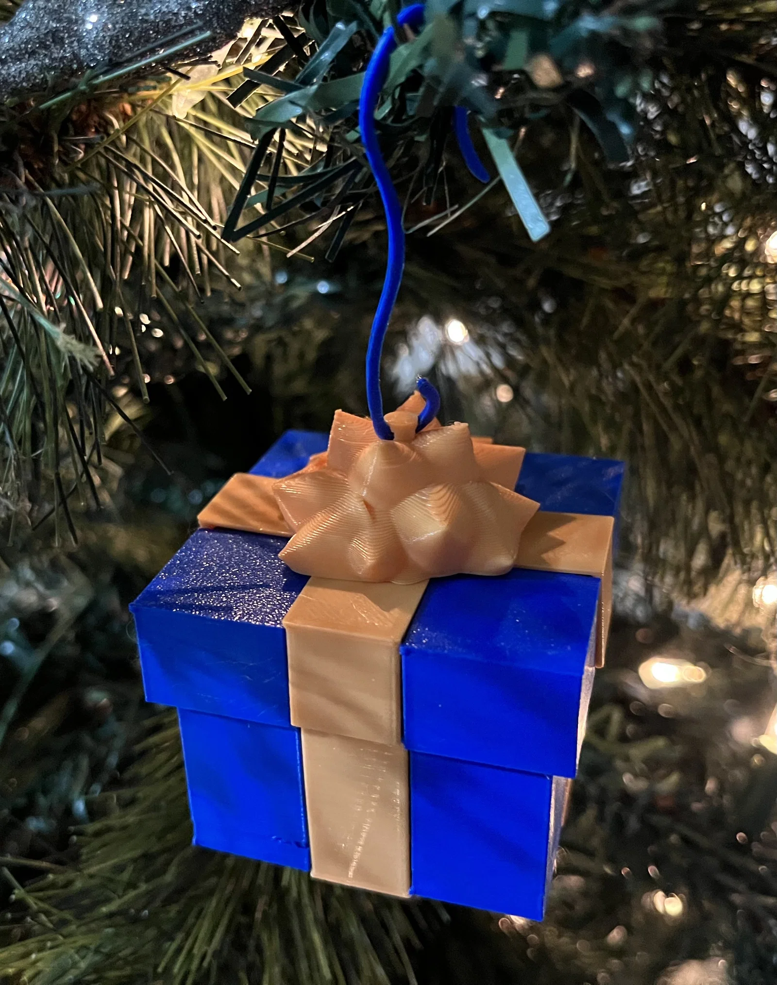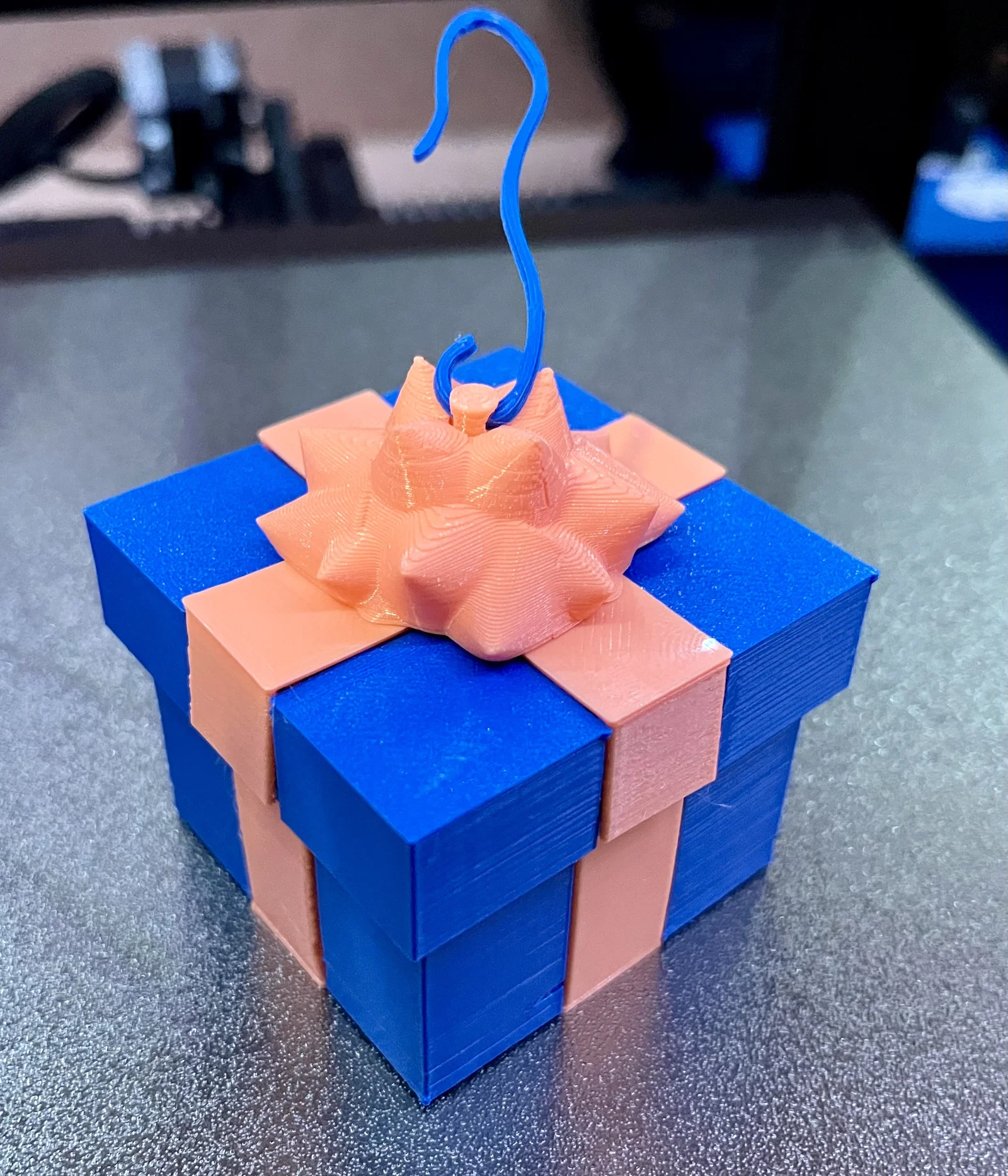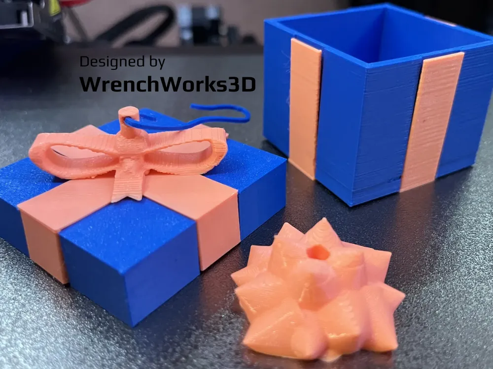 Đây là mẫu hộp quà/vật trang trí dạng mô-đun, cho phép bạn in phần "dây ruy-băng" nhiều màu mà không cần máy in đa màu. Kích thước bên trong là D44 x R44 x C34 mm. Hộp quà này không cần dùng keo, ốc vít hay linh kiện gì cả, nắp hộp được thiết kế với độ dung sai chuẩn nên đóng rất khít. Sản phẩm còn đi kèm với một móc treo đồ trang trí rất chắc chắn và tiện lợi!