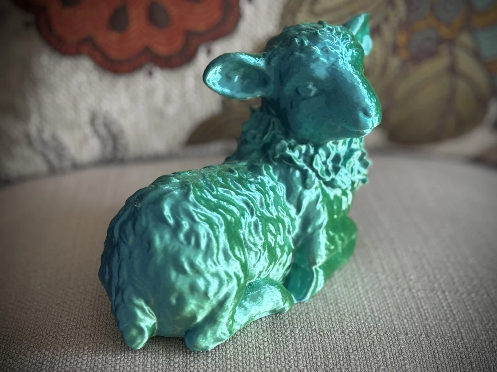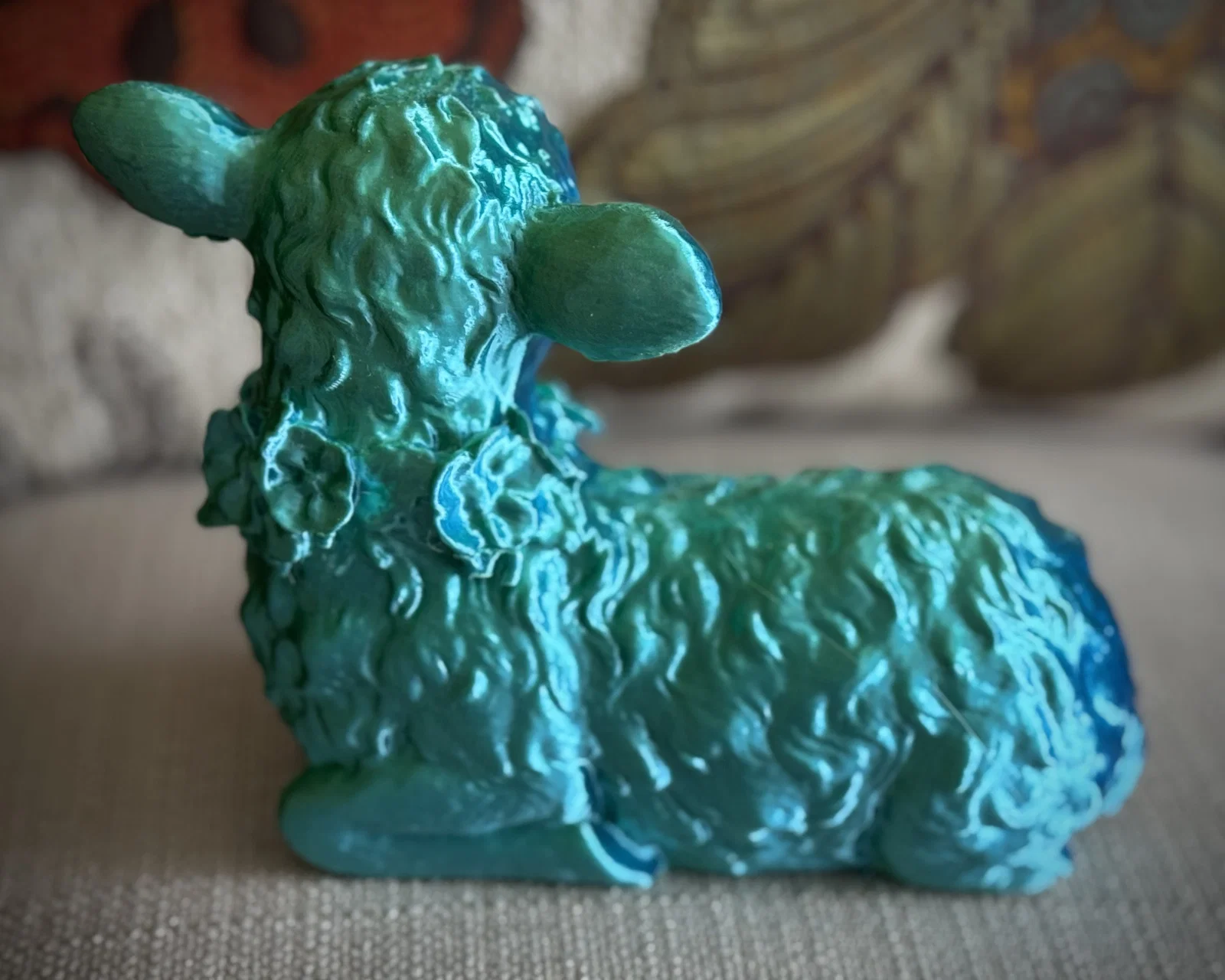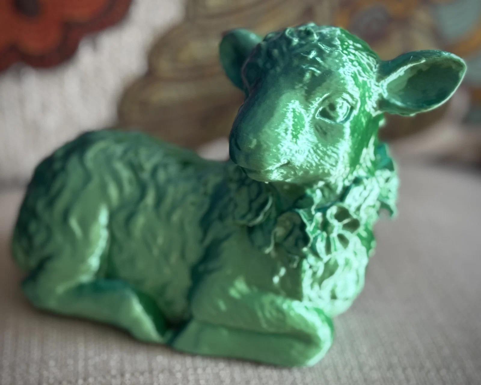 Một mô hình 3D dễ thương hình chú cừu con đang nằm nghỉ ngơi, được điểm xuyết bằng một chiếc vòng hoa xinh xắn. Sản phẩm này được tạo ra từ công nghệ scan 3D với độ chi tiết cao, rất thích hợp để in 3D trang trí.