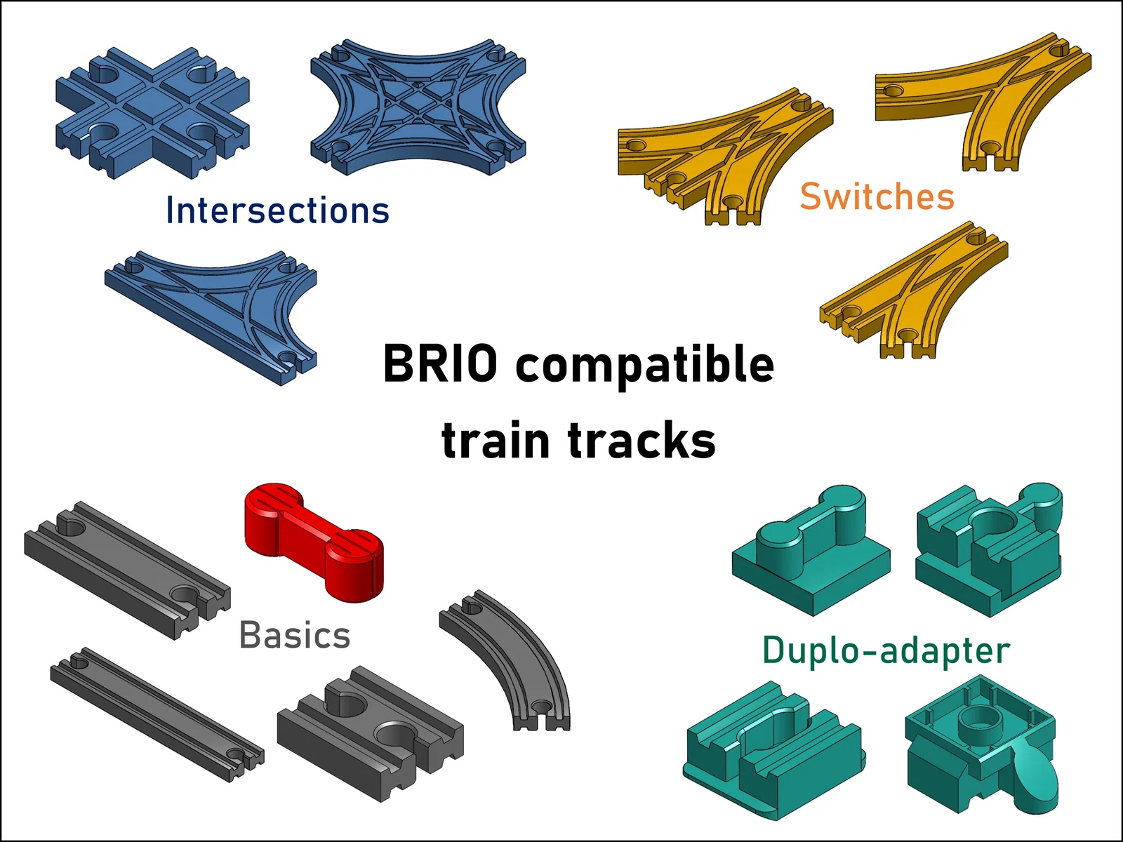 Nhiều loại adapter và các mảnh đường ray khác nhau cho bé thỏa sức vui chơi. Các bộ phận này tương thích với bộ tàu gỗ BRIO. Lưu ý: Mình thiết kế các bộ phận này dựa trên bộ tàu BRIO của mình. Nếu kích thước bộ tàu của bạn có chút khác biệt, độ khít của các mảnh ghép có thể sẽ thay đổi đôi chút.