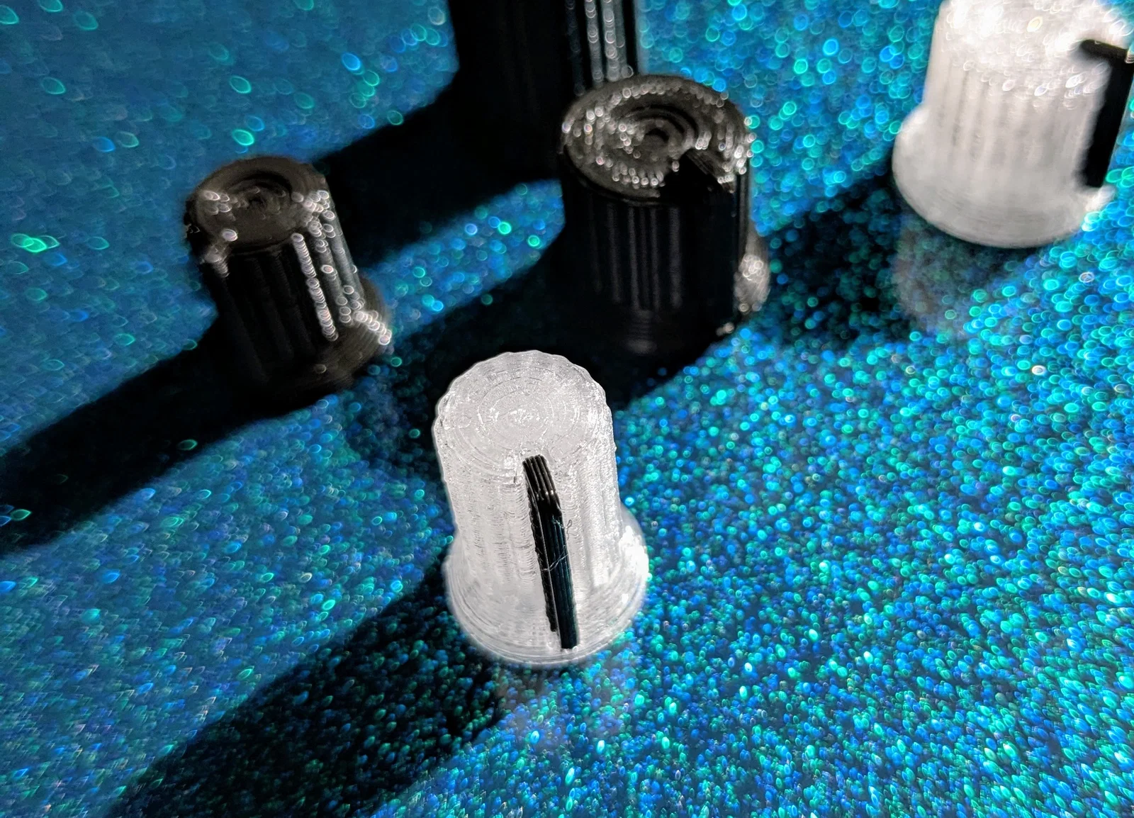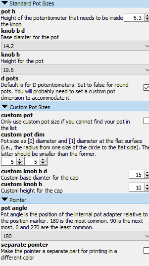 Bộ núm vặn Potentiometer tùy chỉnh cao cho thiết bị DJ, hỗ trợ cả kiểu núm D và tròn. Thiết kế thông minh với tùy chọn in nguyên khối hoặc tách rời vạch chỉ thị, dễ dàng thay đổi kích thước và góc độ qua file OpenSCAD.
