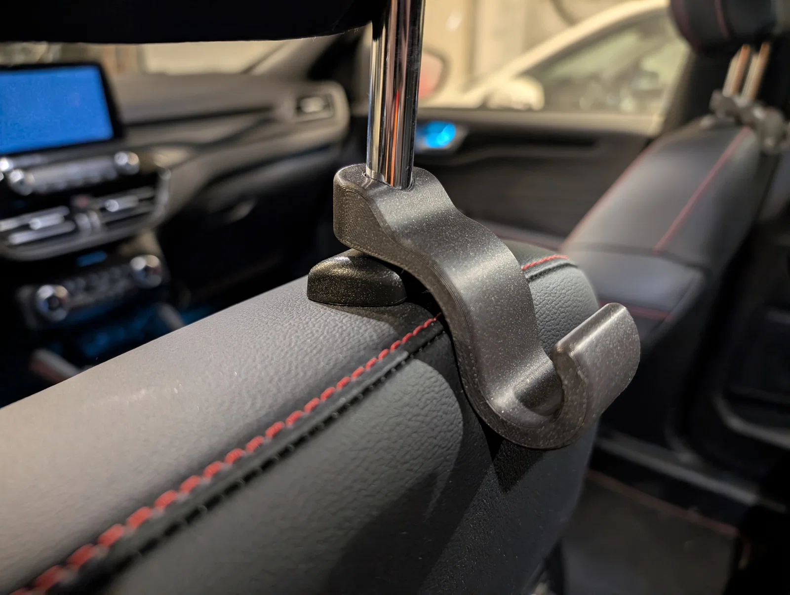 Móc treo tiện ích gắn vào thanh tựa đầu ghế trước dành cho xe Ford Kuga. Phụ kiện này có thể tương thích với nhiều mẫu xe Ford khác có cùng kích thước thanh tựa đầu, giúp bạn treo đồ đạc gọn gàng hơn trong xe.