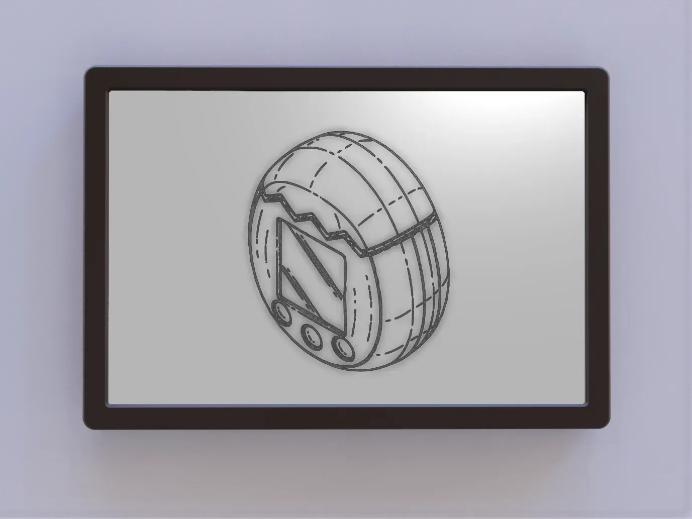 Màn hình nghệ thuật 2D cho một bản vẽ bằng sáng chế của một thiết bị cầm tay thú cưng kỹ thuật số Tamagotchi.