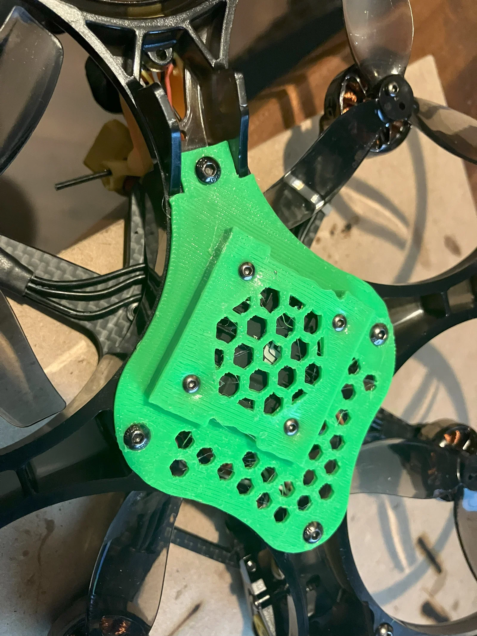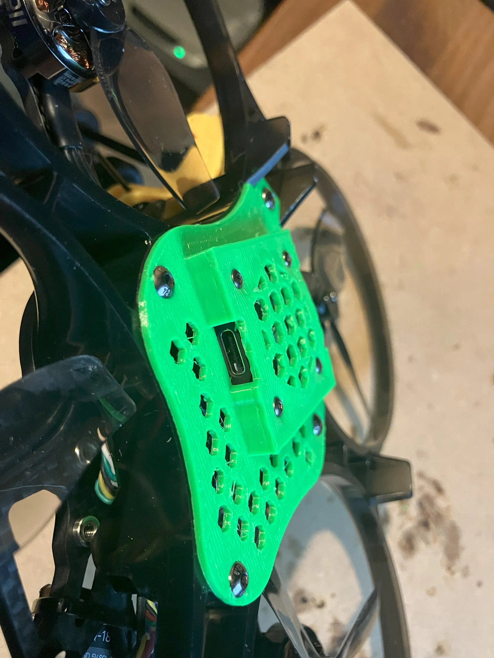 Khung Speedybee Bee35 đi kèm với hai tùy chọn lắp đặt VTX ở mặt dưới - một tấm carbon (phiên bản cơ bản) hoặc một tấm CNC nhôm (phiên bản Pro). Tiếc là không có cái nào lắp vừa khít DJI O4 Air Pro vì nó to hơn O3. Mình đã remix lại một tấm gắn mình tìm được (thiết kế ban đầu cho VTX analog thông thường) và làm cho khoang gắn đủ rộng để chứa VTX DJI O4 Air Pro. Mình in bằng nhựa TPU. Hãy in với mặt chính nằm trên bàn in và dùng support cho khoang gắn VTX ở giữa. Cổng USB vẫn thao tác được. Khe cắm thẻ nhớ SD vẫn dùng được. Nút Bind vẫn nhấn được nếu bạn kéo nhẹ phần nắp (bằng TPU mềm) ra. Bạn vẫn nhìn thấy đèn LED. Ăng-ten luồn qua giá đỡ ăng-ten zin của khung rất dễ dàng. VTX nằm hơi lùi về phía sau và lệch 45 độ so với FC, điều này giúp làm mát tốt hơn, không gian bên trên và xung quanh VTX vẫn rất thoáng khi lắp ráp. Nó không bị nóng quá mức - mình đã bay thử hôm nay tầm nửa tiếng và không thấy bị quá nhiệt (mặc dù nhiệt độ môi trường hôm nay là 3 độ C!). Khi nào SpeedyBee ra mắt miếng CNC tùy chỉnh cho O4 thì chắc chắn sẽ ngon hơn và mình sẽ mua, nhưng O4 mới ra mắt có vài tuần nên SB chưa kịp làm, tạm thời dùng cái này là quá ổn rồi!