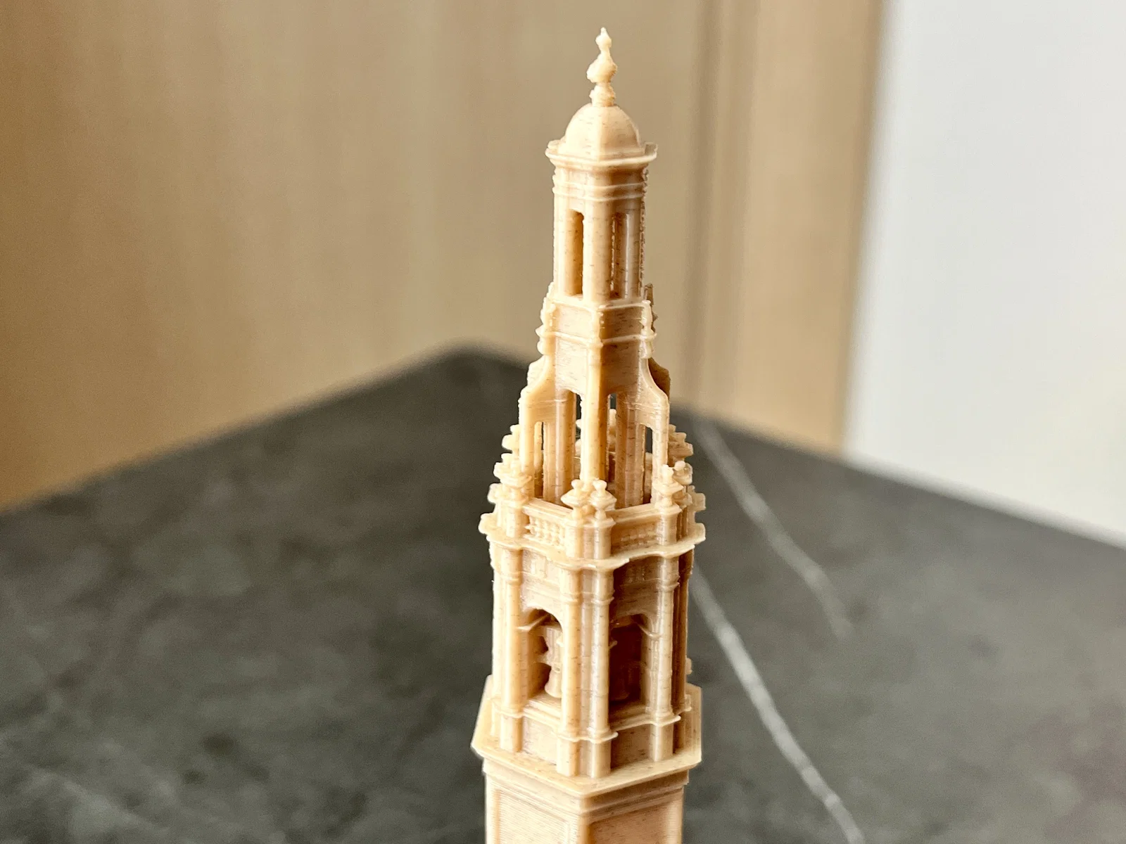 Công trình này được xây dựng vào thế kỷ XVIII theo phong cách baroque và rococo, chịu ảnh hưởng từ các trào lưu kiến trúc Ý thời bấy giờ. Tháp cao gần 50 mét và có thiết kế hình lục giác. Mô hình này chỉ bao gồm phần tháp chuông, không bao gồm toàn bộ nhà thờ _(theo Wikipedia)_.