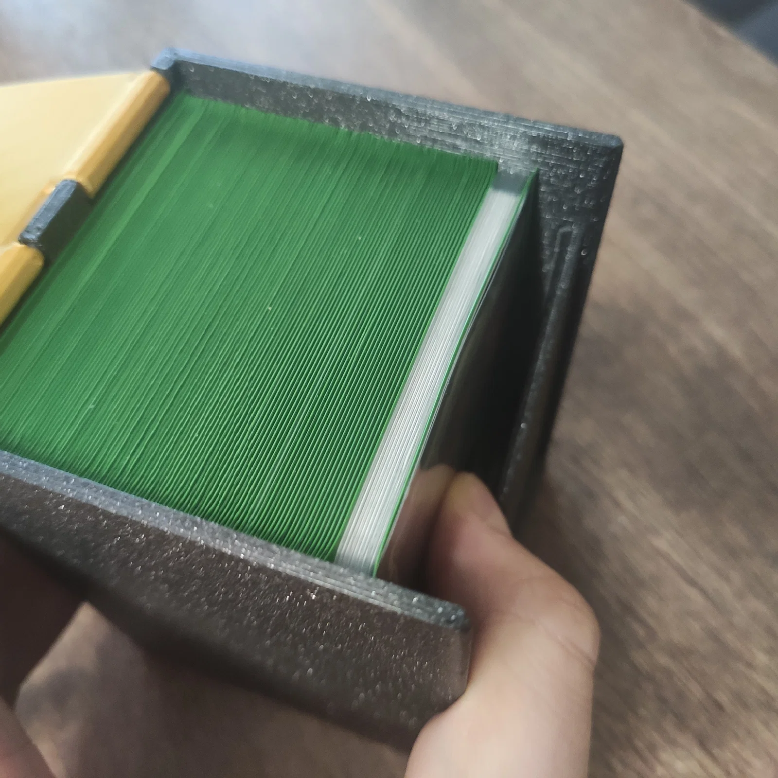 V3: là phiên bản đã tinh chỉnh với rãnh ngón cái hoạt động rất tốt. Mình thích phiên bản dùng chốt gài chặt hơn một chút, nhưng mình cũng đã đăng thêm bản thứ hai cho những bạn có máy in không đạt độ dung sai chuẩn. File f3d đi kèm có biến “depth” để bạn thay đổi tùy ý, ví dụ như cho bài bọc đôi (double sleeved), thêm chỗ đựng token hoặc tùy chỉnh kích thước cho vừa khít với bộ bài của bạn (60 hoặc 250 lá).