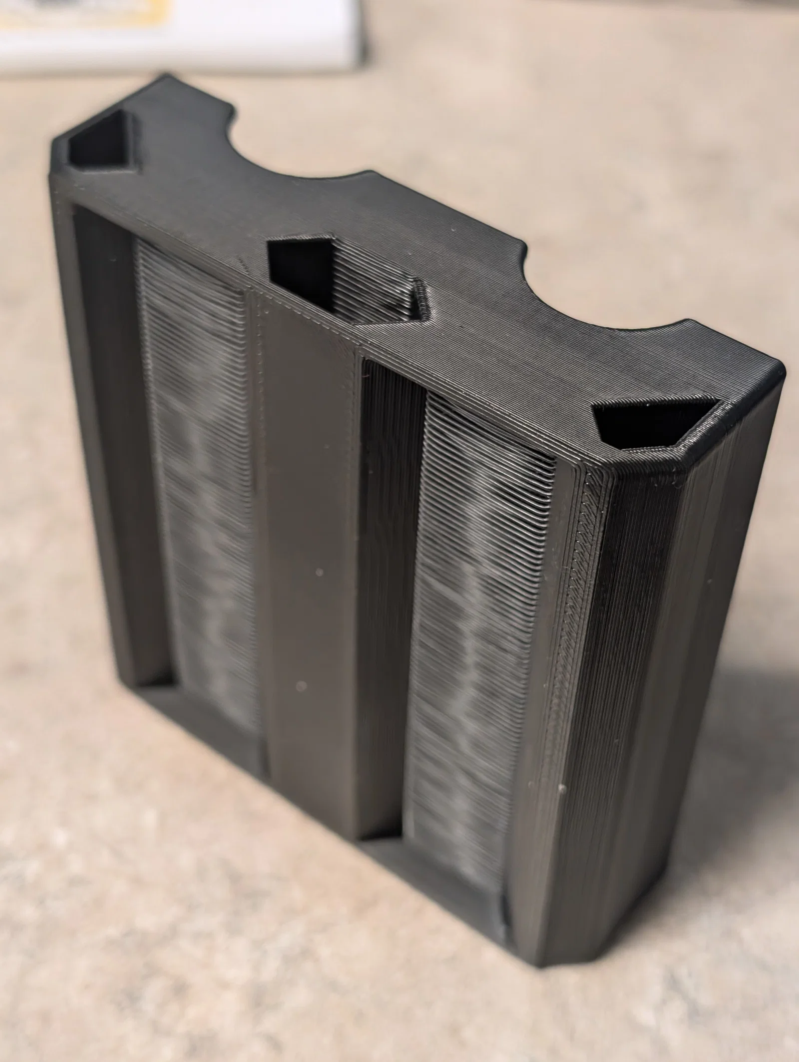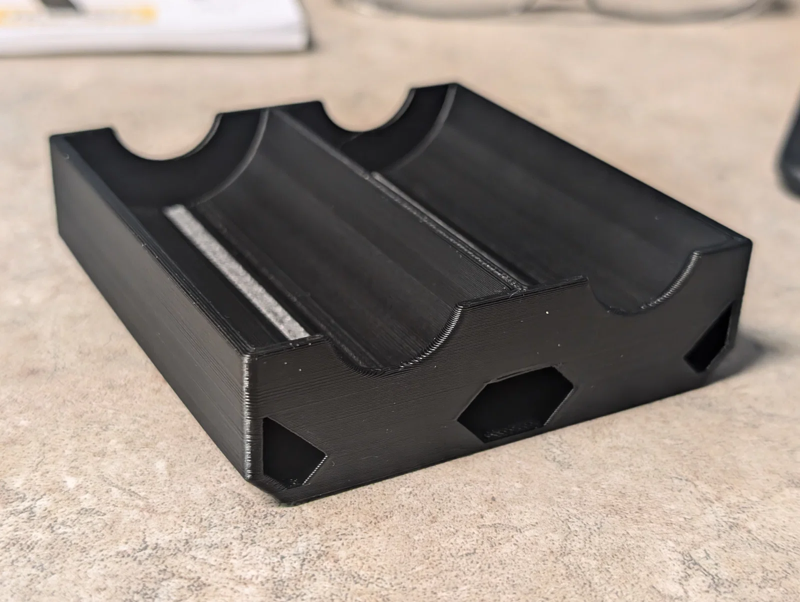 Khay đựng chip poker tiện lợi với sức chứa 50 chip (đường kính 39mm), chia làm 2 ngăn mỗi ngăn 25 cái. Thiết kế thông minh có thể chồng khay lên nhau, không cần support khi in và có lỗ hổng để lấy chip ra cực nhanh chóng và dễ dàng.