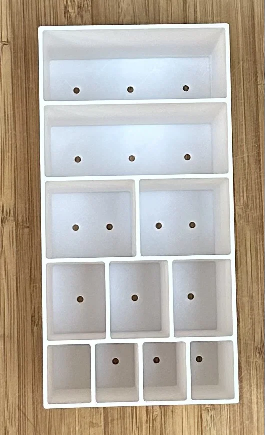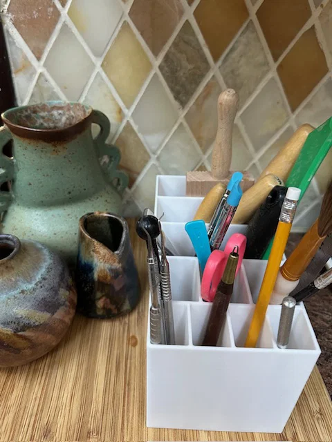 Mình đang làm việc tại một xưởng gốm cộng đồng và cần một cái gì đó đơn giản, gọn gàng để gom các dụng cụ làm gốm lại. Sản phẩm này đặt vừa khít ngay cạnh bàn xoay và trong tủ đồ của mình luôn. Mình dùng nó để đựng thanh tạo hình (rib), miếng bọt biển, dụng cụ tỉa, kim khăm, cọ vẽ và nhiều thứ khác. Mỗi ngăn đều có lỗ thoát nước nhỏ (nhỏ hơn cục tẩy) - trừ một ngăn nhỏ không có lỗ. Ngăn không có lỗ thoát nước này được thiết kế riêng cho kim khăm và các vật dụng mảnh khác mà có thể bị lọt qua lỗ. Điều này giúp bạn không bị mất đồ hoặc bị kim đâm trúng khi đang vội vã dọn dẹp sau buổi làm việc!