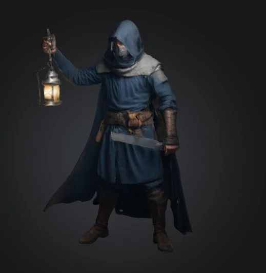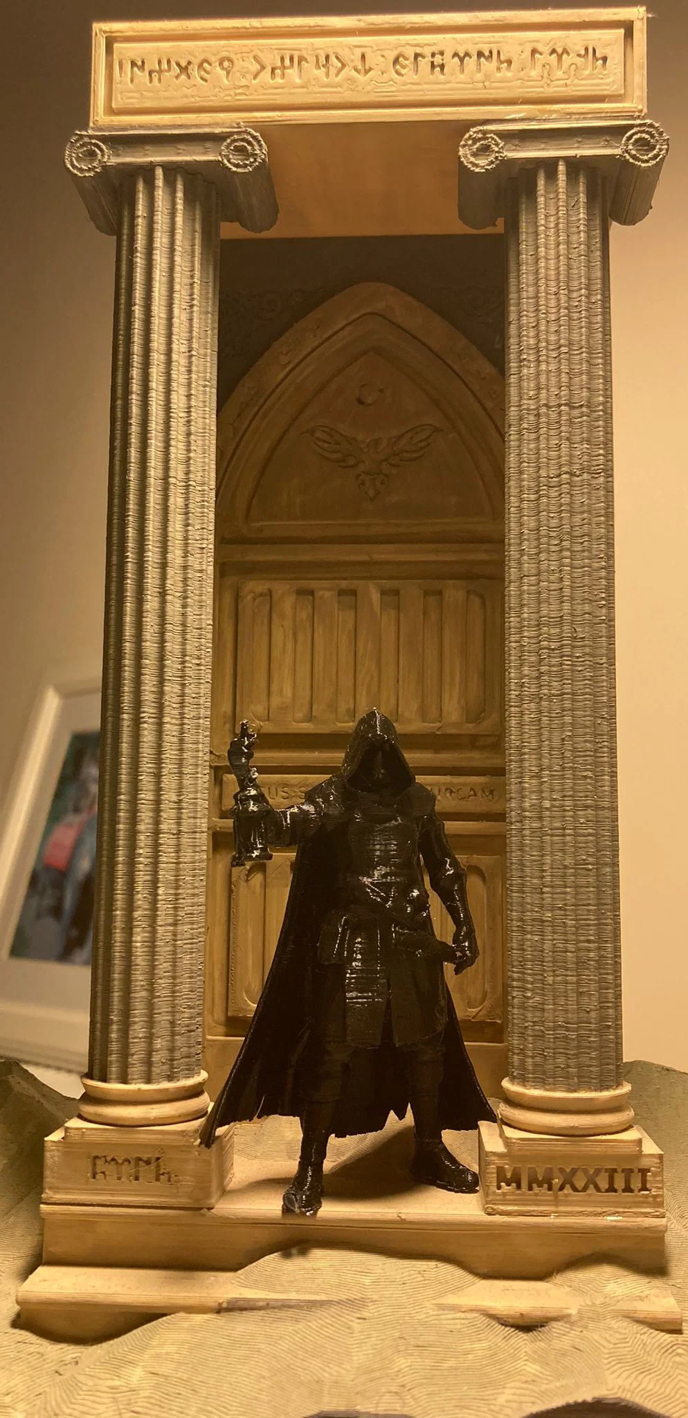 Đây là một mẫu mô hình 3D ấn tượng lấy cảm hứng từ hình tượng sát thủ đầy bí ẩn, thường thấy trong các trò chơi điện tử hay văn hóa đại chúng. Nhân vật sát thủ được thiết kế tỉ mỉ với áo choàng, mặt nạ che kín cùng chiếc đèn lồng trên tay, gợi lên phong cách phiêu lưu, khám phá đầy kịch tính. Điểm nhấn của dự án này không chỉ nằm ở nhân vật chính mà còn ở cấu trúc bệ trưng bày (diorama) theo phong cách kiến trúc cổ điển với hai cột trụ vững chãi, tạo nên một không gian trưng bày trang trọng và đầy chiều sâu cho mô hình.