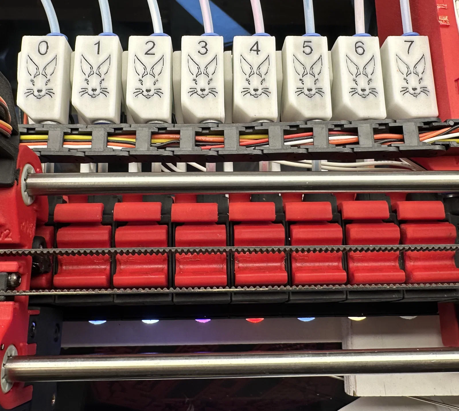 Sau khi hoàn thiện chiếc ERCF v2 của mình, tui thấy khó chịu ngay với hệ thống buffer Cottentail vì nạp sợi nhựa quá cực và lực cản lại lớn. Tui đã thiết kế lại các khối coupler (coupler blocks) để sợi đi theo đường thẳng, đồng thời vẫn giữ được các tính năng gốc như cảm biến pre-gate, đèn LED và phần lò xo giúp giảm áp lực lên các khối nhựa. Tui cũng thiết kế thêm chỗ đặt Happy-Hare ở phía trên cùng với đánh số thứ tự cho từng cổng.
