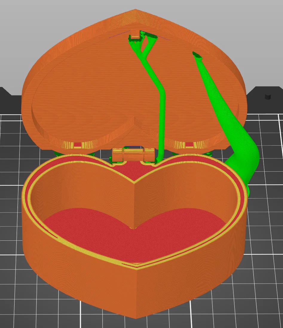 Hộp quà hình trái tim được thiết kế chuyên biệt cho dịp Valentine, hoàn hảo để đựng socola hoặc quà tặng. Bản lề được in liền khối, lưu ý cài đặt 4 lớp tường (perimeters) để sản phẩm hoạt động tốt nhất.