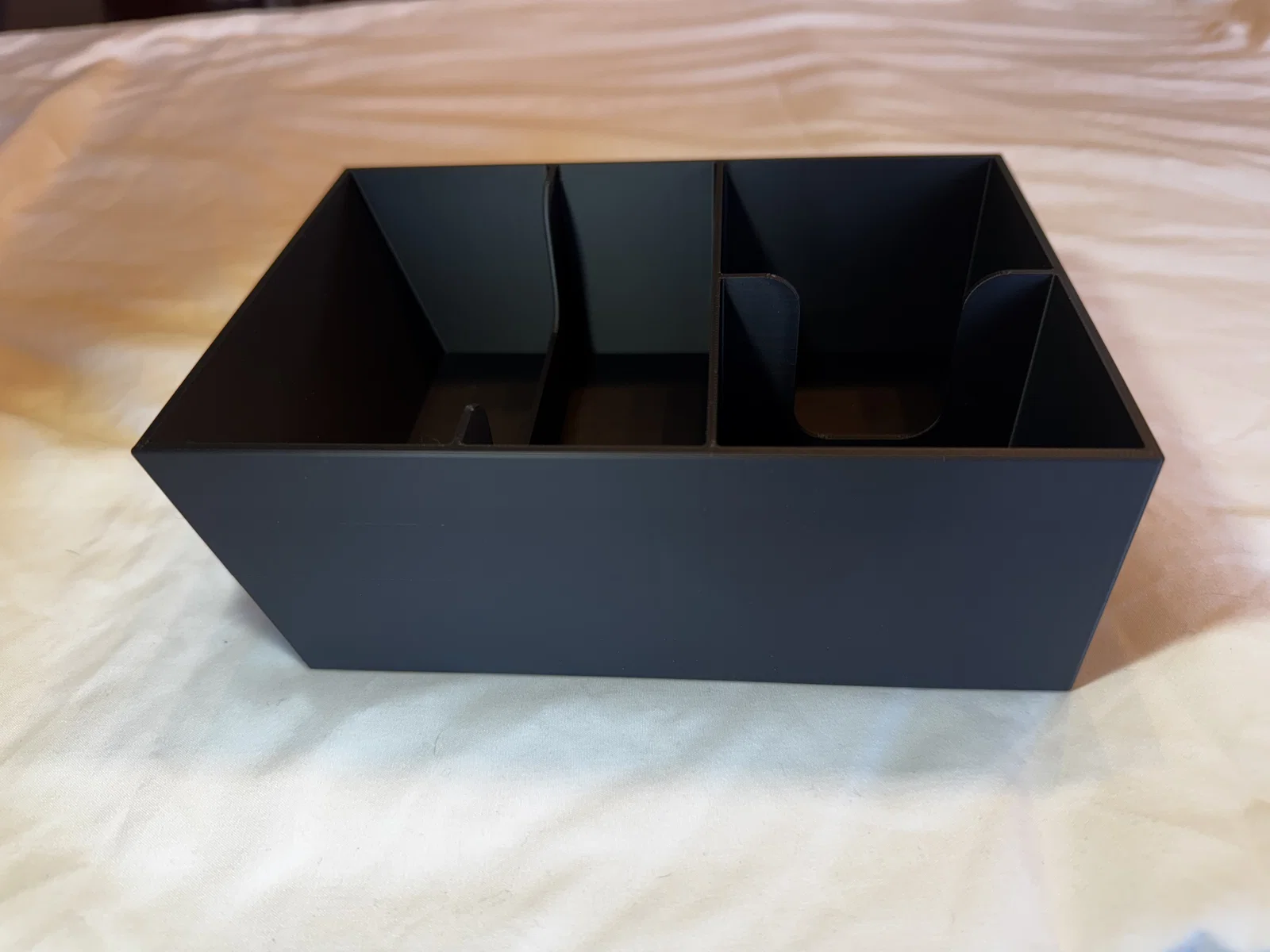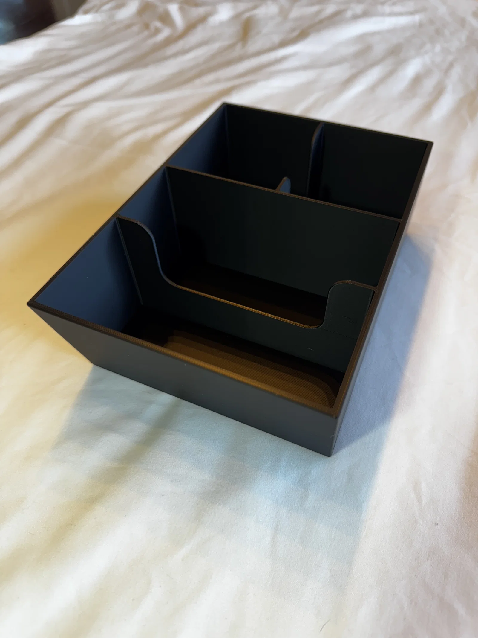 Tui thấy cái hộc đựng đồ ở bệ trung tâm của chiếc Mustang Mach E nó cứ trống trơn, chẳng có vách ngăn gì cả, đồ đạc cứ vứt đại vào một đống nhìn chán lắm. Nên tui đã thiết kế cái khay chia ngăn này để lắp vừa khít vào đó. Khay có 4 ngăn để bác tha hồ sắp xếp đồ đạc mà không lo cấn vào chỗ để chìa khóa đâu nha. Tui cũng đã thiết kế thêm các khe khoét ở hai bên vách, giúp bác dễ dàng đưa tay xuống lấy đồ ở ngăn dưới mà không bị cấn hay chật chội.