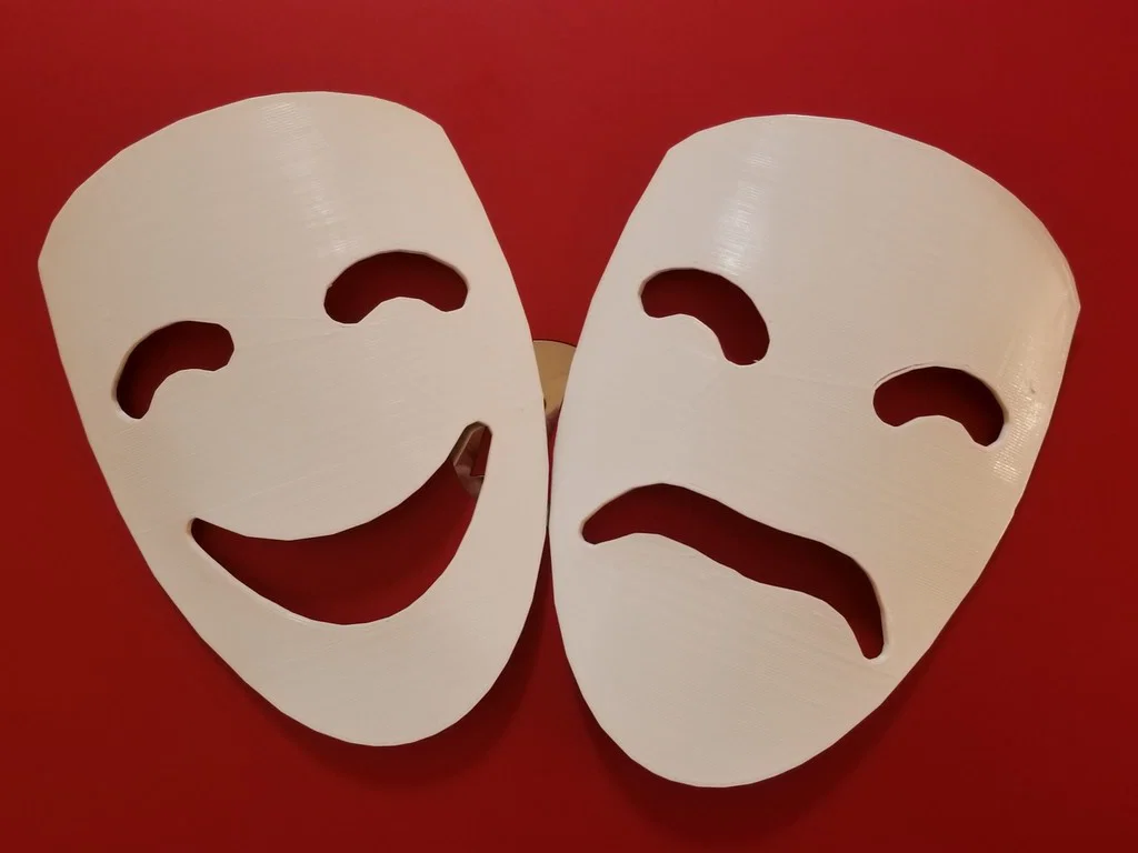 Mẫu mặt nạ sân khấu Vui/Buồn được in phẳng bằng nhựa PLA, sau đó làm mềm trong nước sôi để tạo hình cong trên bề mặt tùy chỉnh. Sản phẩm rất phù hợp để làm quà tặng, trang trí hoặc sơn vẽ nghệ thuật theo ý thích.