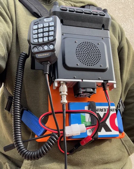 Yaesu FTM-150R(ASP) là một chiếc bộ đàm khá tốt để bắt các vệ tinh FM repeater. Nó có khả năng phát song công (crossband duplex), bộ lọc hài tốt và bộ thu nhạy. Tuy nhiên, khá cồng kềnh khi vừa cầm ăng-ten beam (Arrow hoặc Elk) vừa phải cầm micro, ghi lại tín hiệu và theo dõi vệ tinh trên điện thoại. Tôi đã thiết kế giá đeo ngực đơn giản này để giữ máy bộ đàm, micro và một viên pin 3Ah (Bioenno BLF-1203AB).