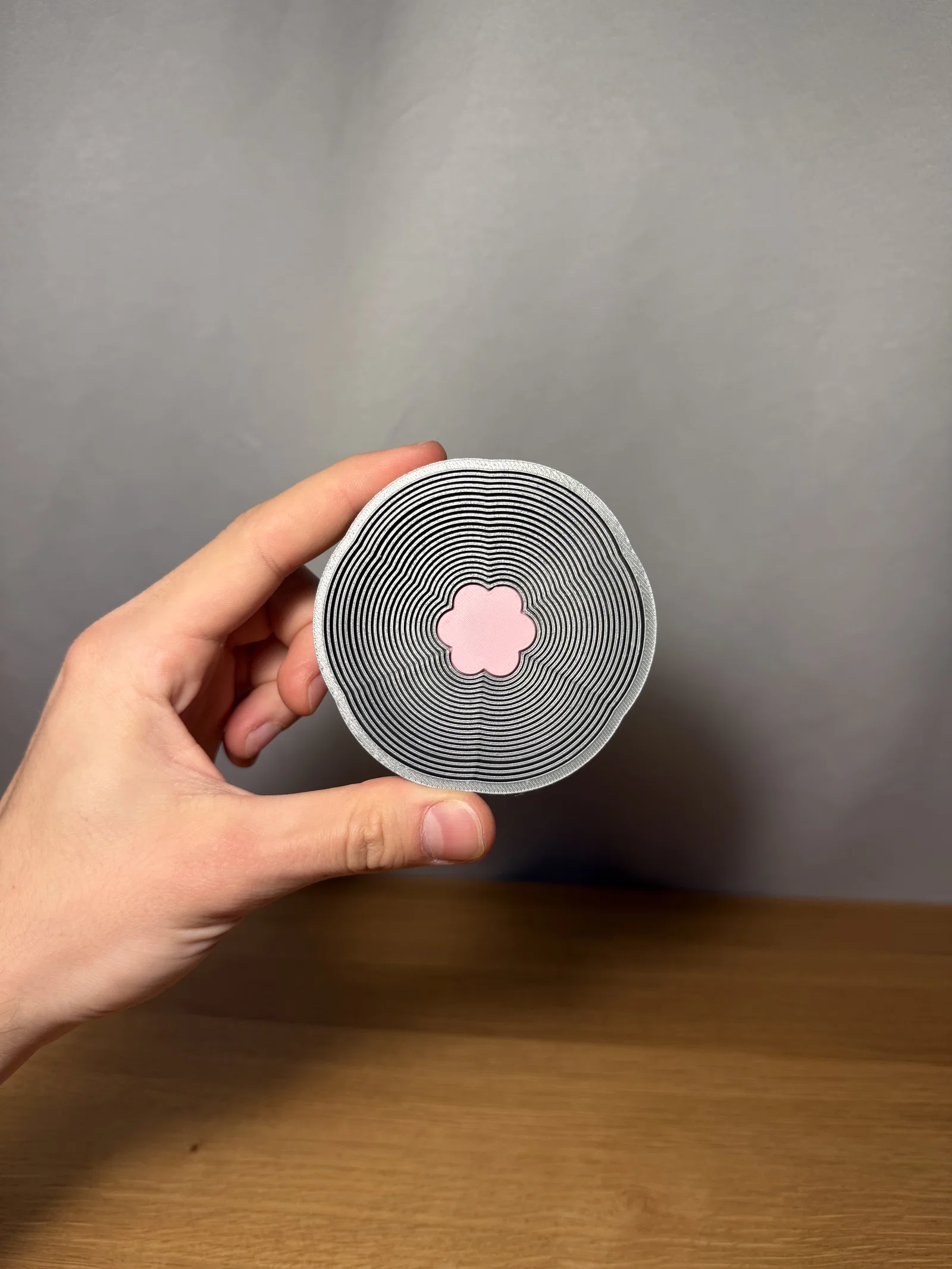 Thiết kế bao gồm các lớp lồng vào nhau, có thể nhấn và di chuyển, tạo ra trải nghiệm xúc giác mượt mà. Phần tâm hình bông hoa tạo thêm chi tiết thị giác tinh tế trong khi vẫn giữ được vẻ ngoài gọn gàng và tối giản.