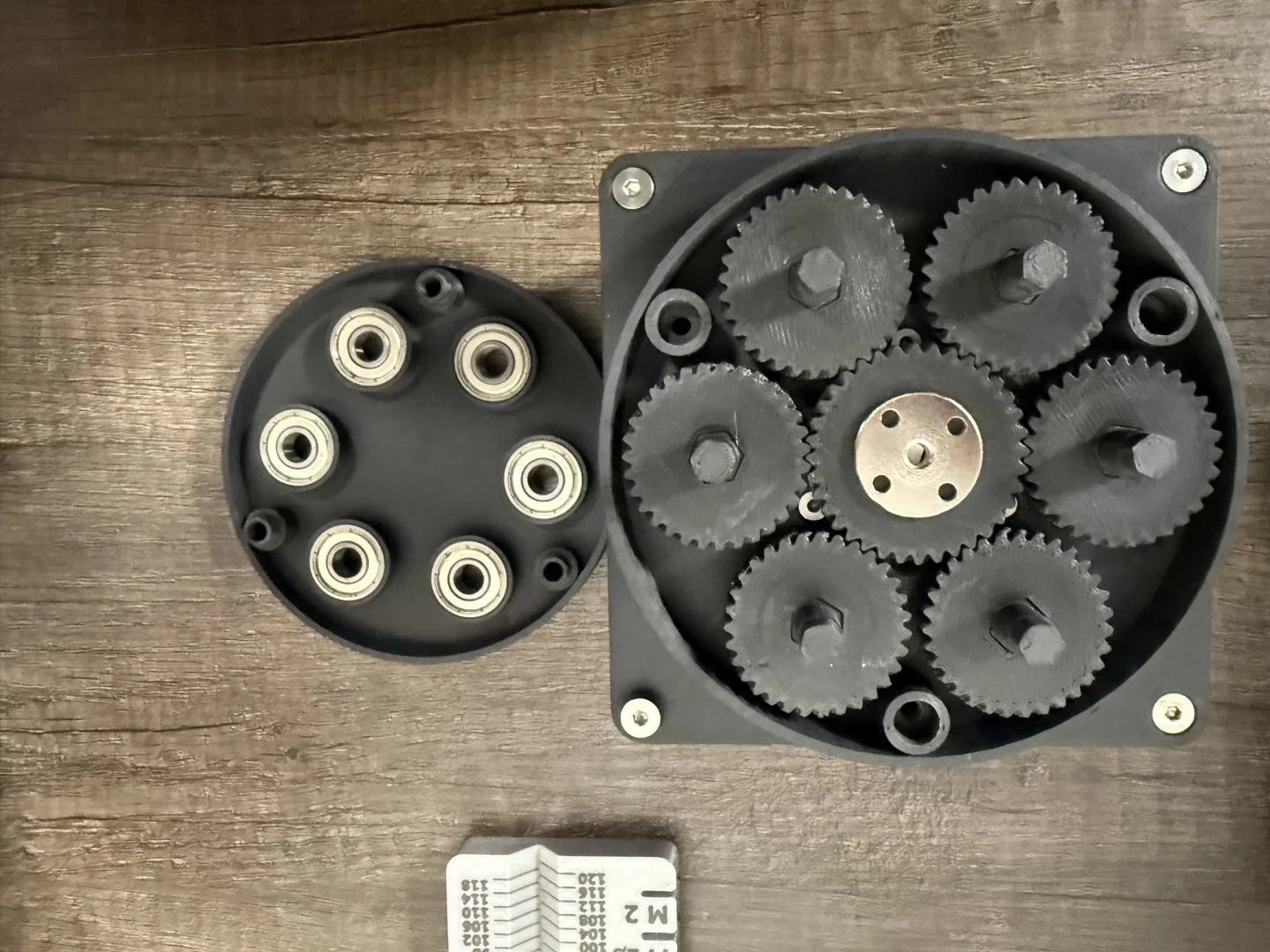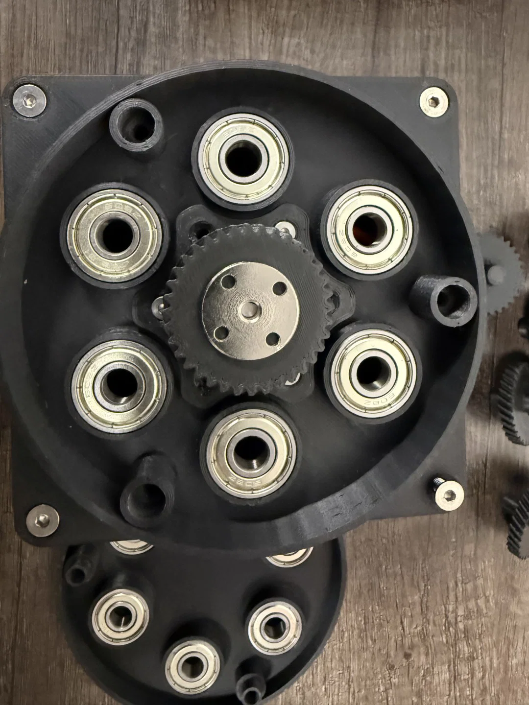 Lắp bánh răng nhỏ vào trục và đặt chúng vào vòng bi trên đế hộp số. Lắp 6 vòng bi còn lại vào tấm trên của hộp số, đặt lên trên các trục bánh răng sao cho khớp 3 lỗ bắt vít. Đậy tấm trên lại và cố định tất cả bằng 3 ốc đầu bằng M4x30mm.