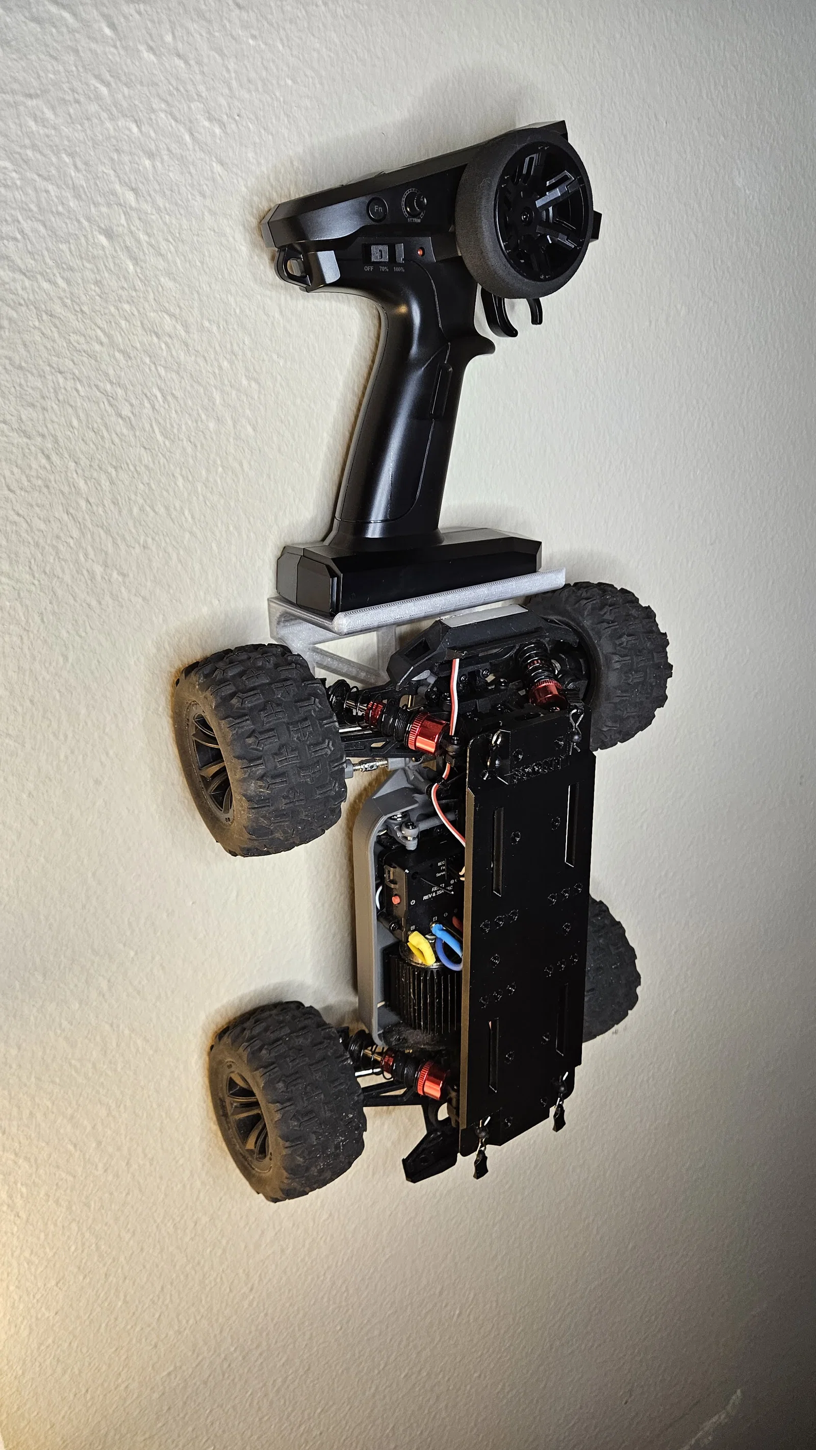 Nếu bác nào đang chơi xe mô hình RC tỉ lệ 1/18 hoặc 1/16 thì chắc hẳn luôn đau đầu với việc cất giữ sao cho gọn gàng mà không chiếm quá nhiều diện tích bàn làm việc. Mẫu giá treo tường 3D này chính là cứu cánh tuyệt vời giúp bác giải quyết vấn đề đó một cách triệt để. Thiết kế này không chỉ giữ cho chiếc xe RC của bác được treo thẳng đứng an toàn mà còn đi kèm một phần giá đỡ riêng biệt phía trên dành cho tay điều khiển (transmitter), giúp bộ đôi này luôn đi cùng nhau, tránh thất lạc.