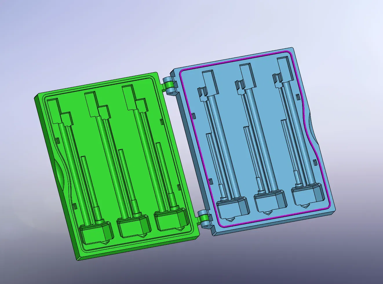Phần dưới (màu xanh trong hình, bản lề đôi) là phần để sử dụng như khay lưu trữ, phần còn lại (bản lề đơn) được thiết kế để làm nắp đóng - nó có dung sai mở rộng và bo tròn để cho phép xoay quanh phần vỏ hotend dày hơn ở phía trên.