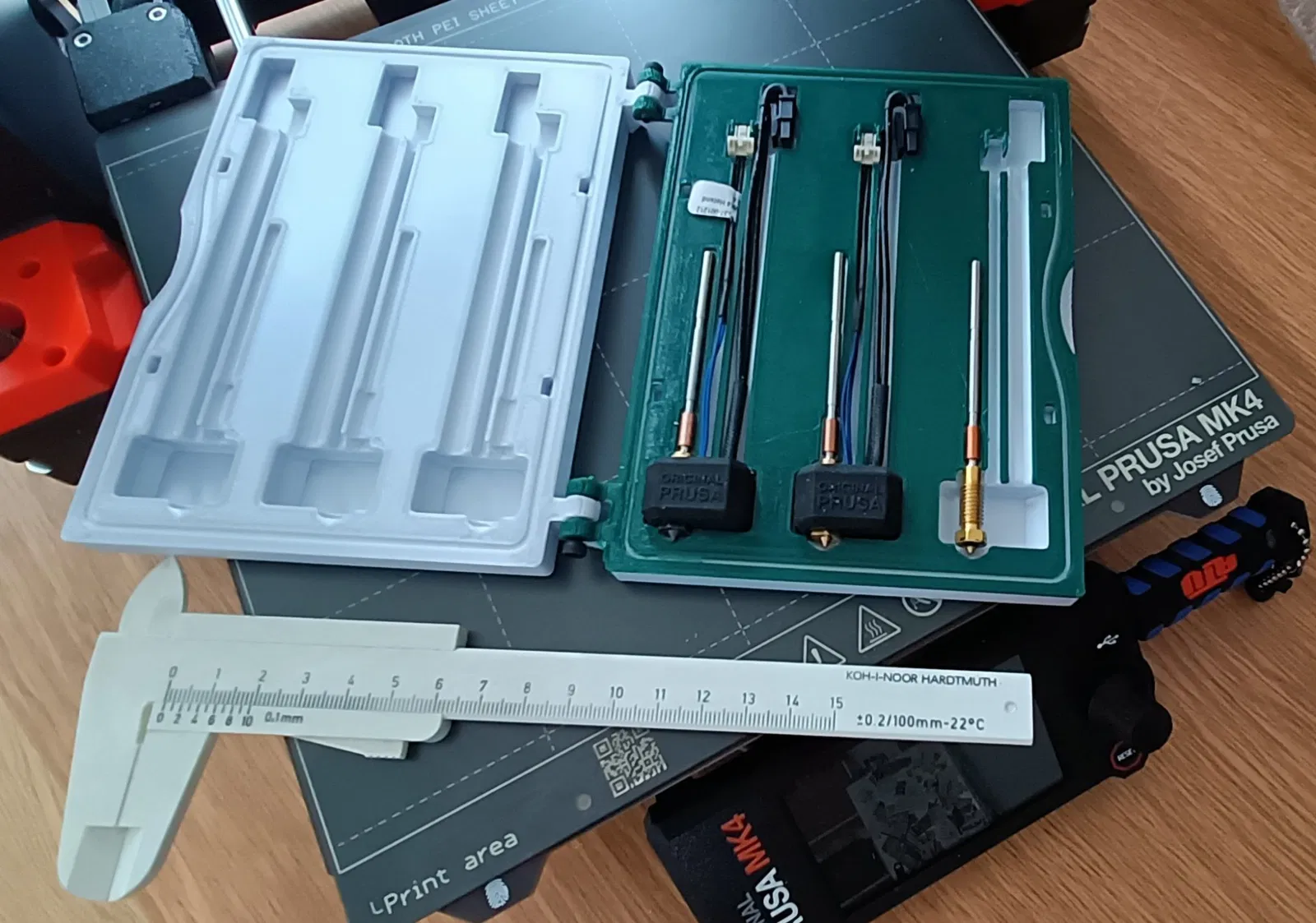 Nếu bạn đang tìm kiếm nơi lưu trữ cho ba hotend hoàn chỉnh của MK4, điều này có thể giúp bạn. Hộp được thiết kế để chứa toàn bộ các bộ phận hotend/nozzle với vỏ silicone, và các dây cáp thẳng (lắp đặt) với đầu nối cong của bộ gia nhiệt và đầu nối cảm biến nhiệt thẳng. Nếu bạn muốn cải thiện cách ly không khí xung quanh, bạn có thể sử dụng miếng đệm tùy chọn và chèn nó vào rãnh xung quanh phần dưới (không cần cho chức năng lưu trữ hoặc nắp).