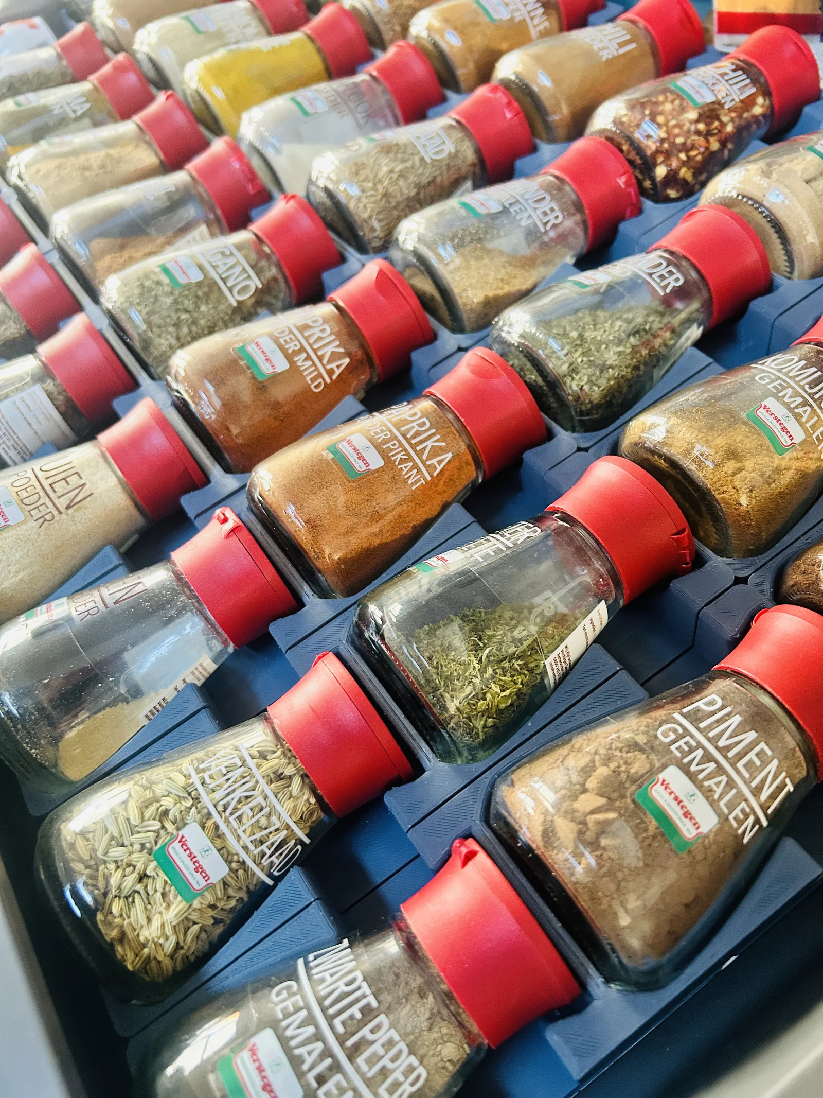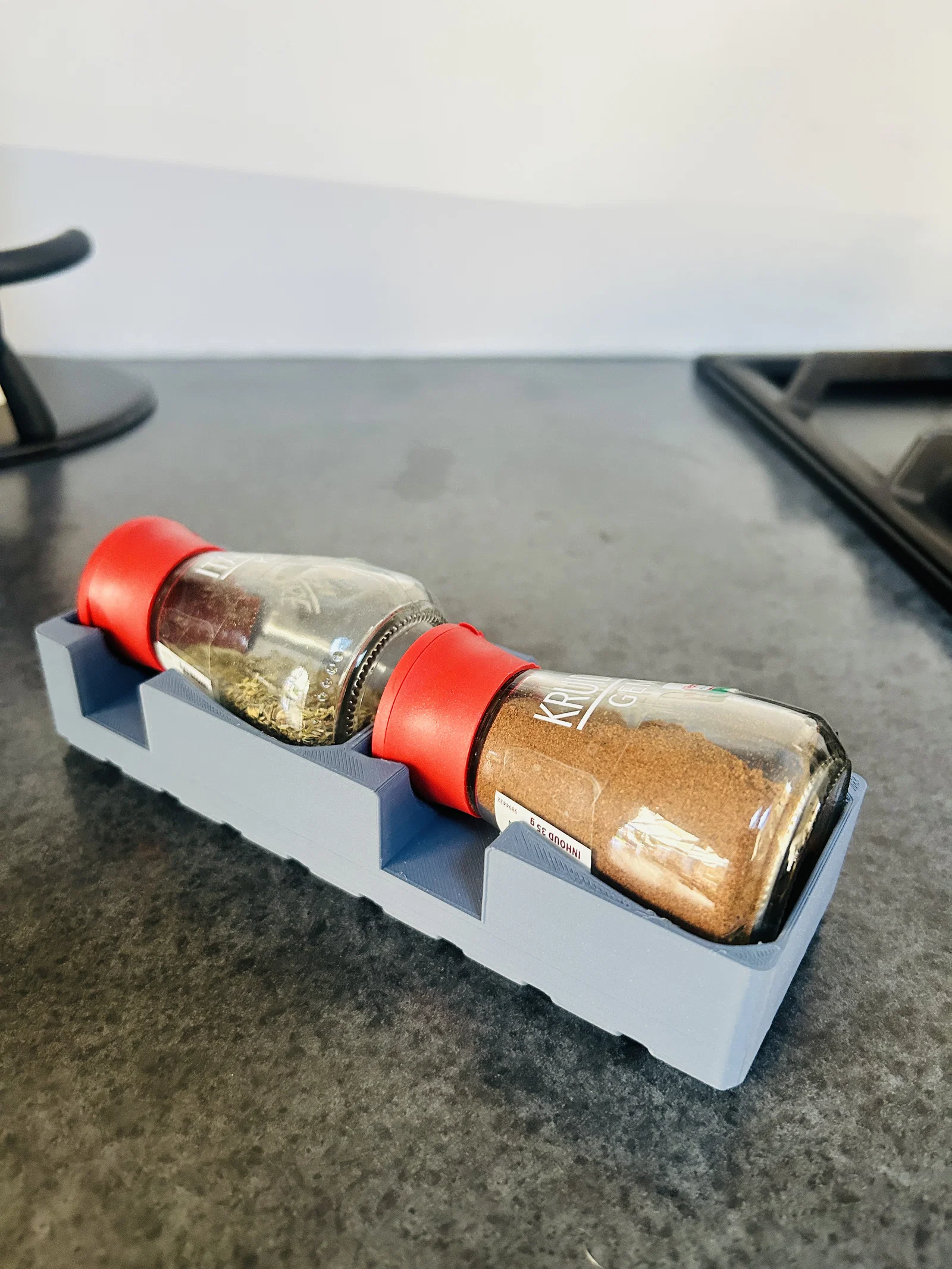 Một đế đựng gia vị Gridfinity được thiết kế để chứa 2 hũ gia vị 'Verstegen' tiêu chuẩn (thường thấy tại Hà Lan). Sản phẩm được dựa trên kích thước nửa ô lưới (half grid) của hệ thống Gridfinity giúp tối ưu hóa không gian lưu trữ của bạn.