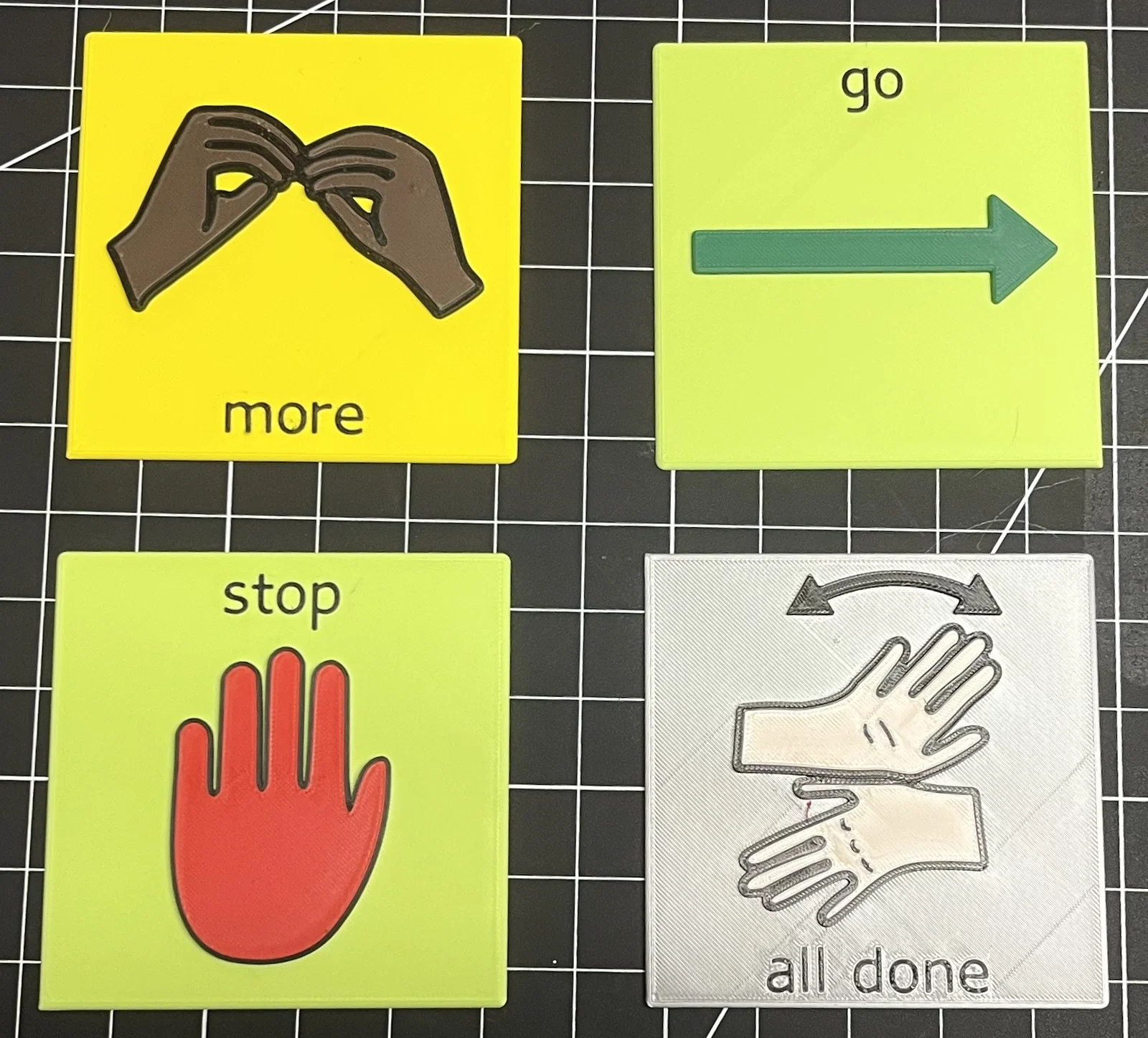 Bộ biểu tượng giao tiếp hình vuông kích thước 4 inch với các hình ảnh nổi. Đây là dự án in 3D đa màu giúp hỗ trợ học tập hiệu quả, cho phép người dùng tùy chỉnh màu sắc linh hoạt theo nhu cầu sử dụng thực tế của học sinh.