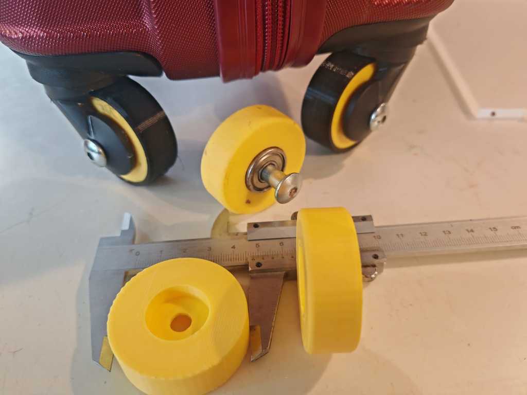 Bánh xe vali du lịch kèm lốp và vòng bi. Bánh xe cũ trên vali của mình bị mòn đến mức không thể dùng được nữa. Vali này có dung tích khoảng 39 lít với kích thước tầm 40x55x22. Mình đã in phần bánh xe bằng nhựa PLA với độ đặc (infill) khoảng 80%, còn phần lốp thì dùng nhựa TPU. Vòng bi và bu-lông mình tận dụng từ giày trượt patin cũ. Trục của bánh xe cũ cần phải cắt bỏ. Thông số kỹ thuật: đường kính bánh xe: 48mm, đường kính lốp: 52mm, đường kính vòng bi: 22mm. Độ dày bánh xe: 17mm, độ dày lốp: 19mm, độ dày vòng bi: 7mm.