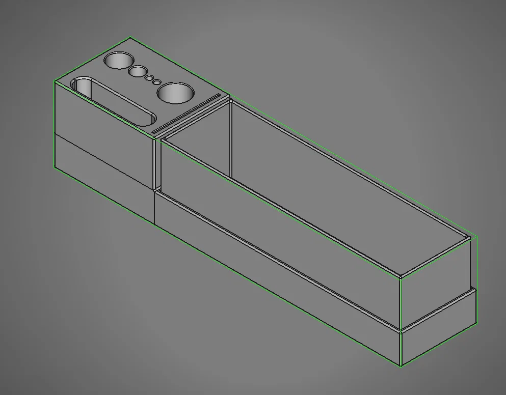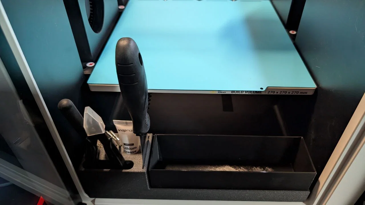 Mình thiết kế cái hộp này để đặt ngay phía trước printbed, vừa để sẵn những món tool hay xài nhất vừa hứng mấy mẩu nhựa nhỏ ;)