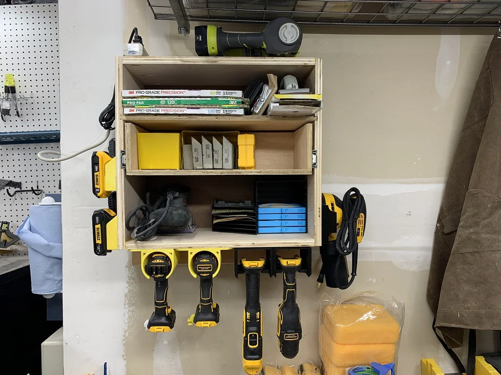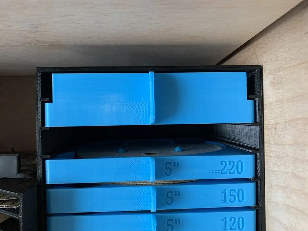 Tôi đã sửa đổi thiết kế ngăn kéo từ để sử dụng mẫu tay cầm thay thế của tác giả. Tôi điều chỉnh một trong các lỗ xỏ ngón tay để nó thông suốt qua ngăn kéo, giúp dễ lấy các đĩa nhám cuối cùng còn sót lại. Tôi cũng thêm các chốt căn chỉnh. Việc này giúp giữ đĩa đúng vị trí, nhưng mục đích chính là để dễ căn chỉnh khi lắp vào máy chà nhám, tránh làm bịt các lỗ hút bụi. Bạn chỉ cần xoay máy chà nhám sao cho một trong các lỗ hướng về phía lỗ xỏ ngón tay khi nhấn xuống. Một trong các mặt trước của ngăn kéo được để trống để bạn có thể tự thêm chữ trong TinkerCAD hoặc dùng máy dán nhãn.