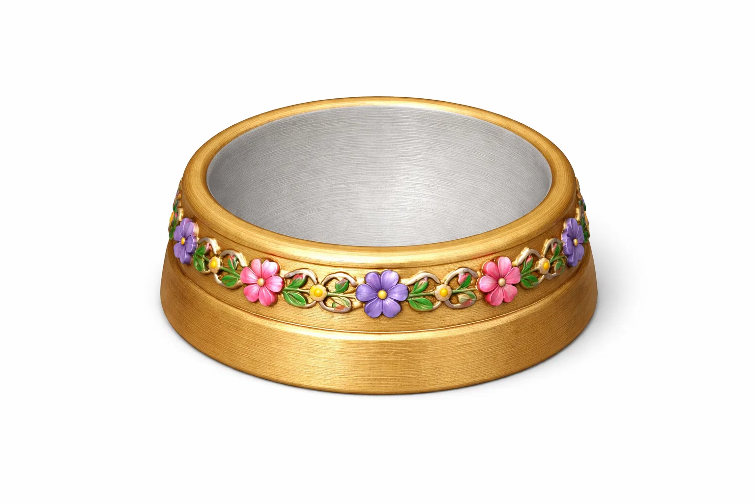 Thiết kế của bát có dạng hình trụ tròn với thành bát dày dặn, vững chãi, hạn chế tình trạng đổ ngã khi thú cưng đang dùng bữa. Điểm nhấn đặc biệt của mẫu in này chính là đường viền trang trí hình hoa nổi bật chạy quanh thân bát. Những chi tiết hoa văn được chạm khắc tinh xảo không chỉ tạo vẻ đẹp sang trọng mà còn giúp bạn dễ dàng phối màu nếu muốn sáng tạo thêm bằng cách sơn vẽ thủ công sau khi in xong.
