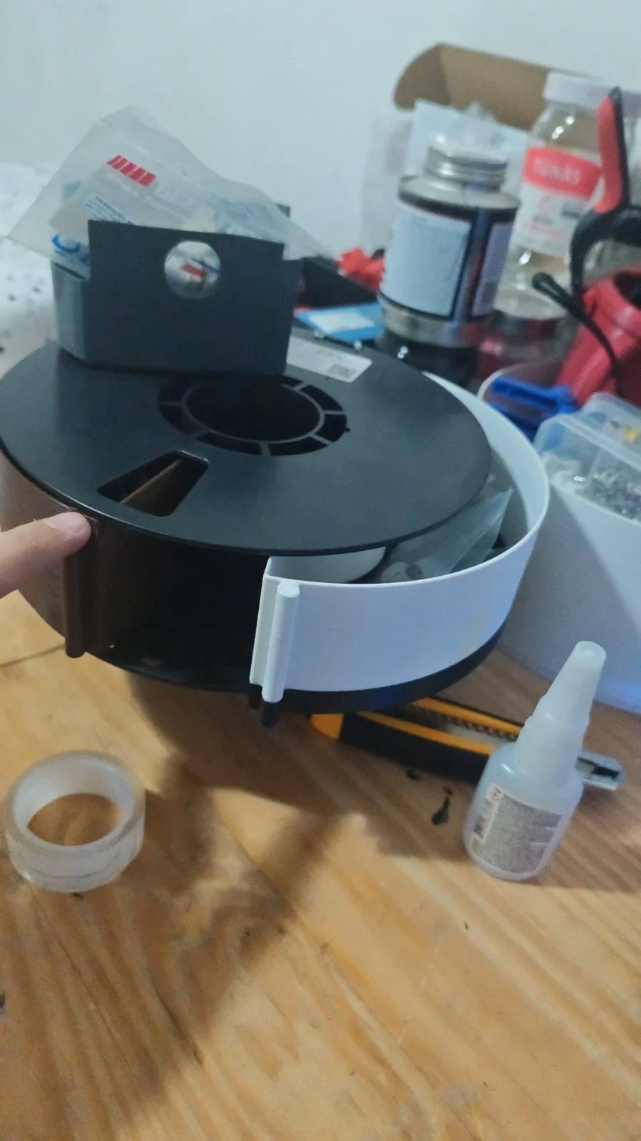 Đây là mẫu hộp lưu trữ tận dụng lại các lõi nhựa (spool) rỗng. Mình thấy bỏ đi thì phí quá mà gửi trả lại thì không khả thi, để không thì chiếm diện tích nên mình quyết định tự thiết kế một cái hộp lưu trữ. Ban đầu mình có tìm kiếm vài mẫu có sẵn nhưng không có cái nào vừa với loại lõi nhựa này, thế nên mình tự tay thiết kế luôn vì cũng đang bắt đầu tập tành vẽ 3D. Mình cố gắng thiết kế sao cho đơn giản nhất, tiết kiệm nhựa in nhất mà vẫn đảm bảo tính hữu dụng. Mẫu này được in 100% bằng nhựa ABS. Trong trường hợp cái chốt giữ bị gãy, bạn có thể dễ dàng thay thế bằng một con ốc vít mà không gặp khó khăn gì. Trong tất cả những cái mình đã làm thì chỉ có một cái bị gãy do mình lỡ tay dùng lực quá mạnh. Mình sẽ để sẵn file f3d cho bạn nào muốn làm bản remix nhé.