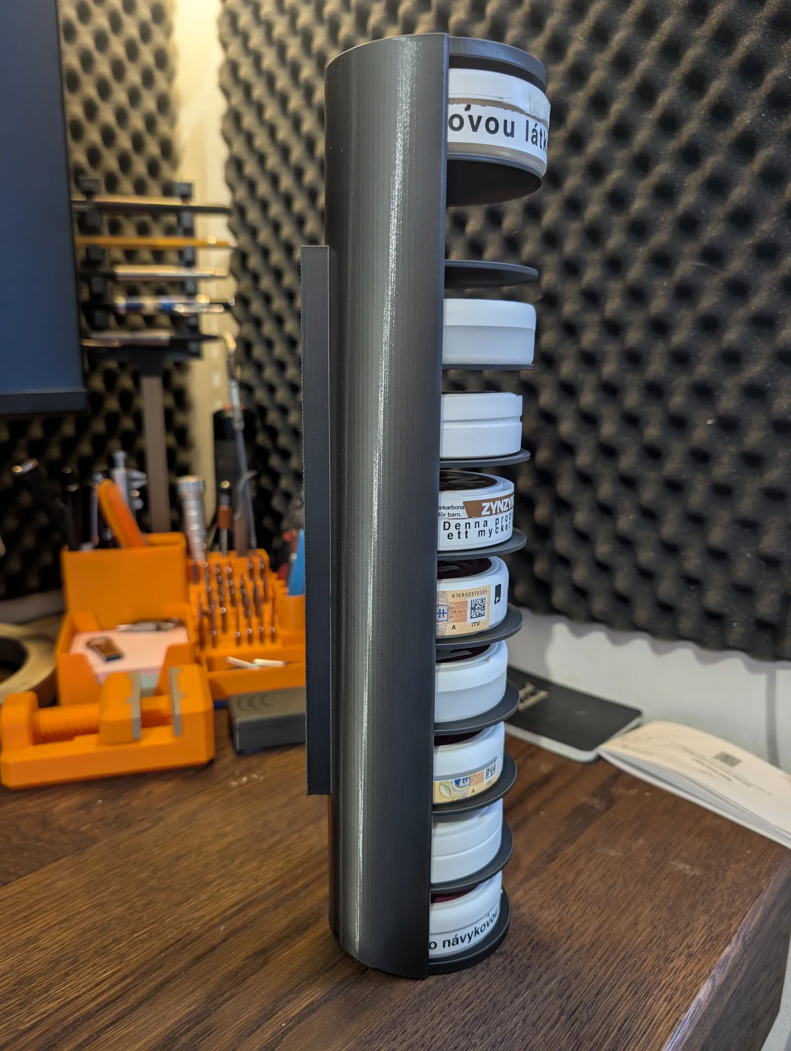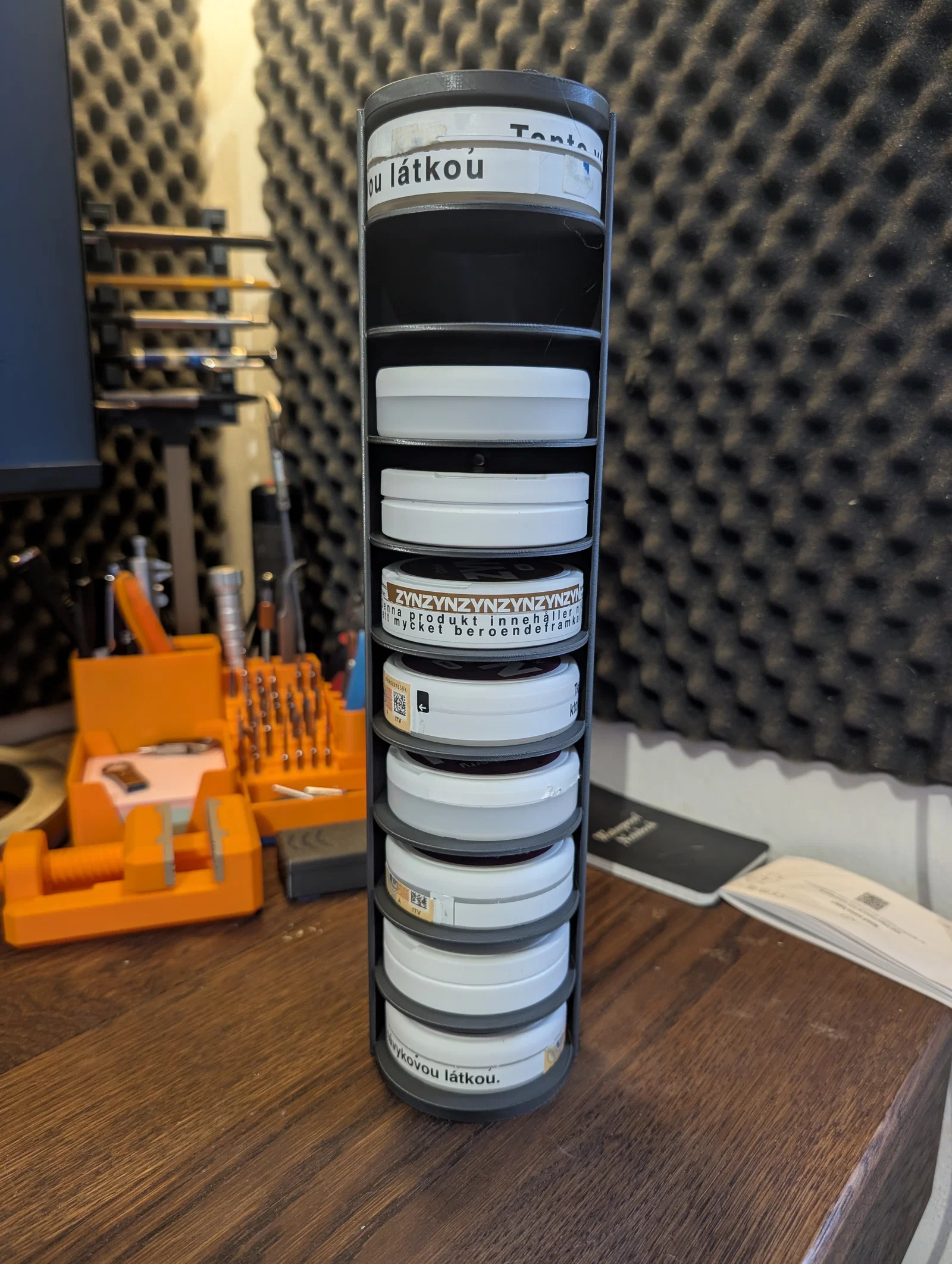 Mình muốn làm một cái kệ treo tường cho xưởng để đựng mấy con ốc vít nhỏ và linh kiện điện tử. Những hộp đựng ZYN mà mình tích lũy được thật sự rất hoàn hảo để làm khay chứa đồ nhỏ. Mẫu này khá lớn, nhưng mình đã in được bằng cách đặt chéo góc trên máy Creality K2. Nếu mọi người quan tâm, mình sẽ cân nhắc làm thêm một phiên bản nhỏ hơn để có thể in phẳng trực tiếp trên bàn in.