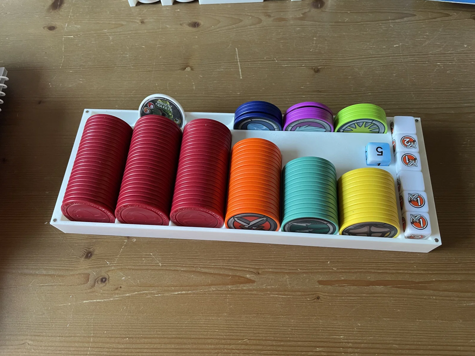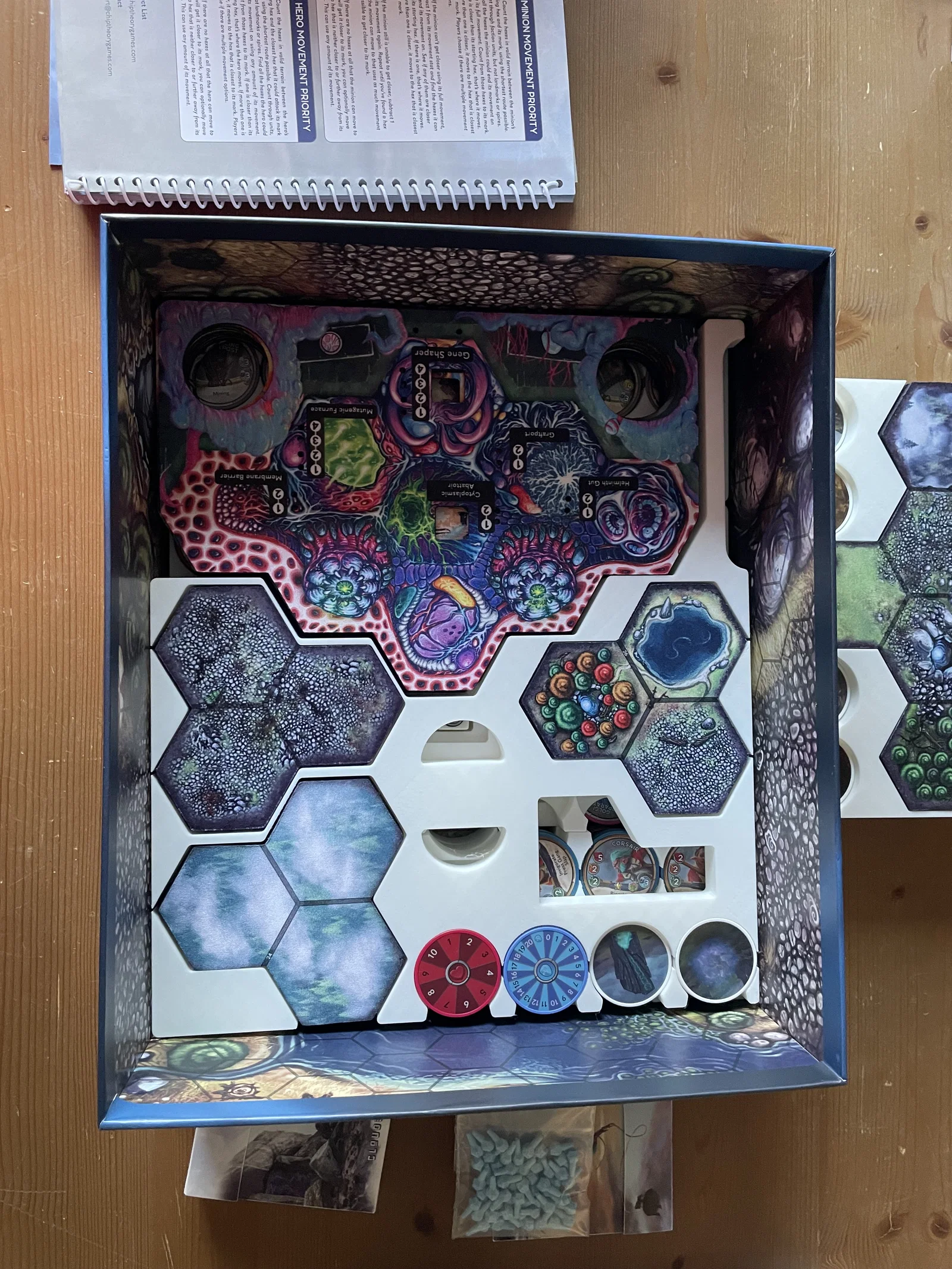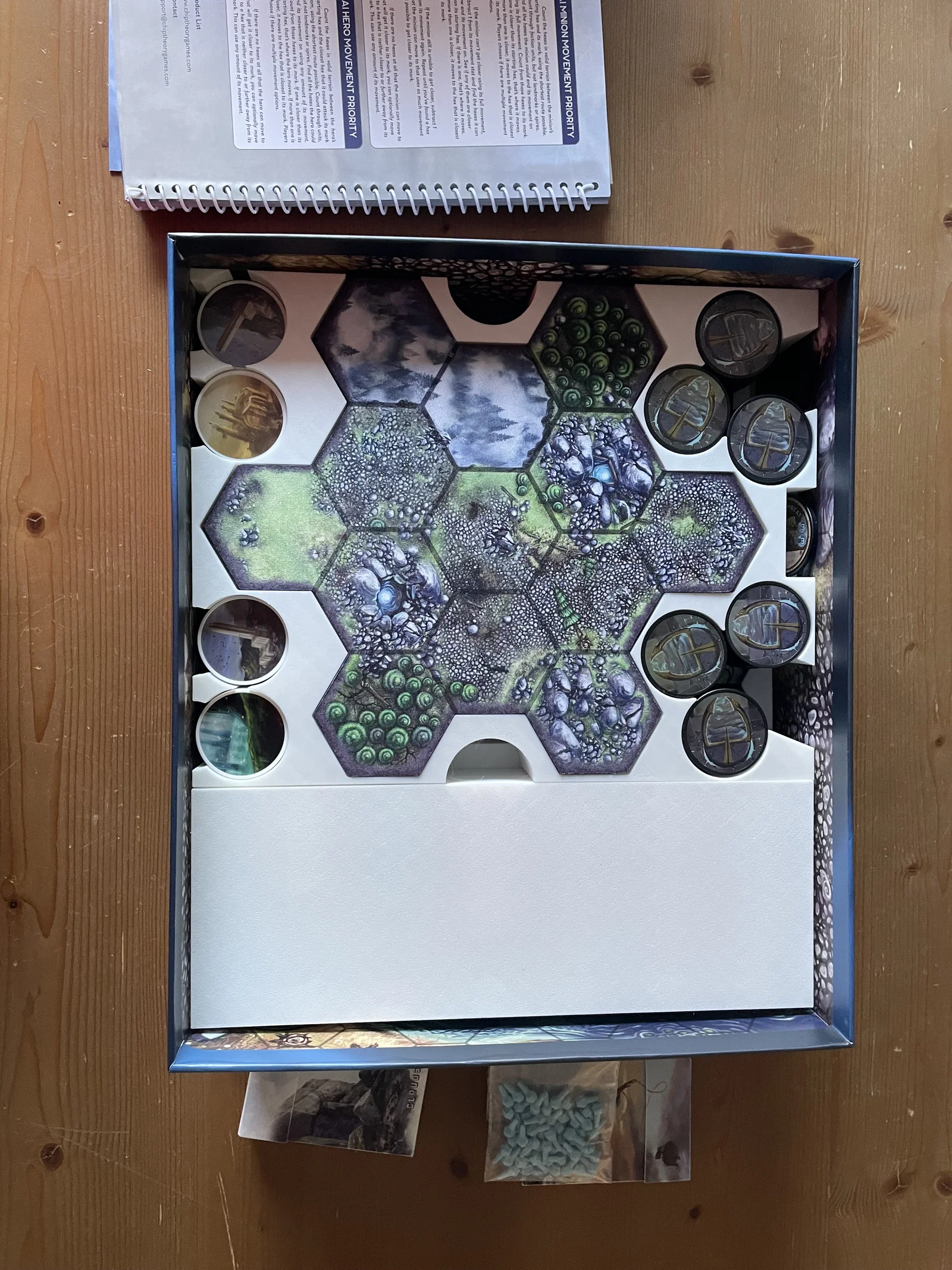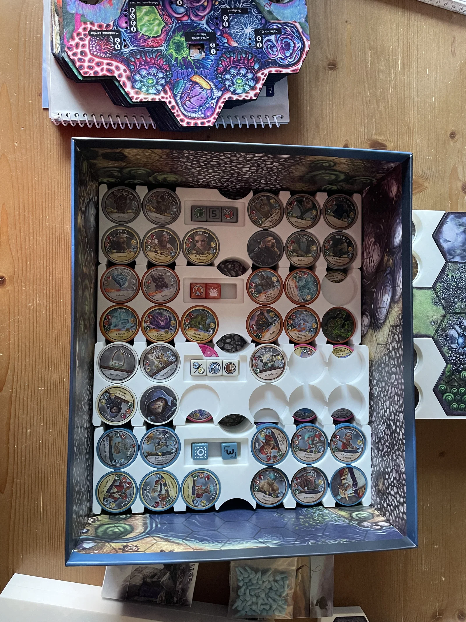 Khay này có thể chứa nhiều sách luật và kịch bản, nhưng không thể chứa hết tất cả, vì vậy bạn cần cất những cuốn không dùng tới ở nơi khác. Ngoài ra, hộp đựng các thanh nâng cấp pháo đài (fortress upgrade sticks) không vừa, mình đã cho vào một cái túi nhỏ để cất.