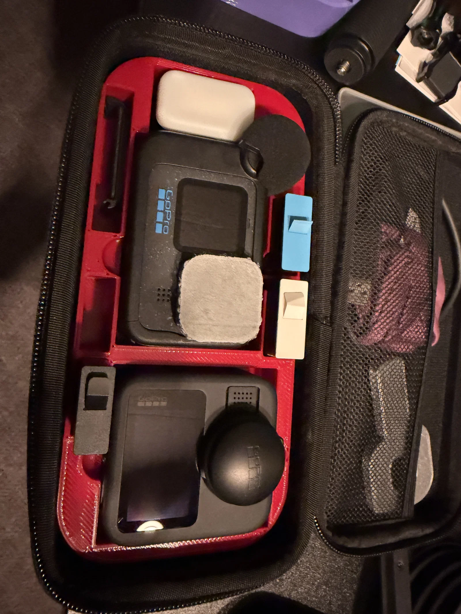 Bản thiết kế này đã được tùy chỉnh lại phần khoét ống kính cho GoPro Max 2. Thay vì khe thẻ SD, phiên bản này bổ sung thêm chỗ đựng pin và ngăn nhỏ để chứa các linh kiện rời khác, giúp bạn sắp xếp phụ kiện gọn gàng hơn.