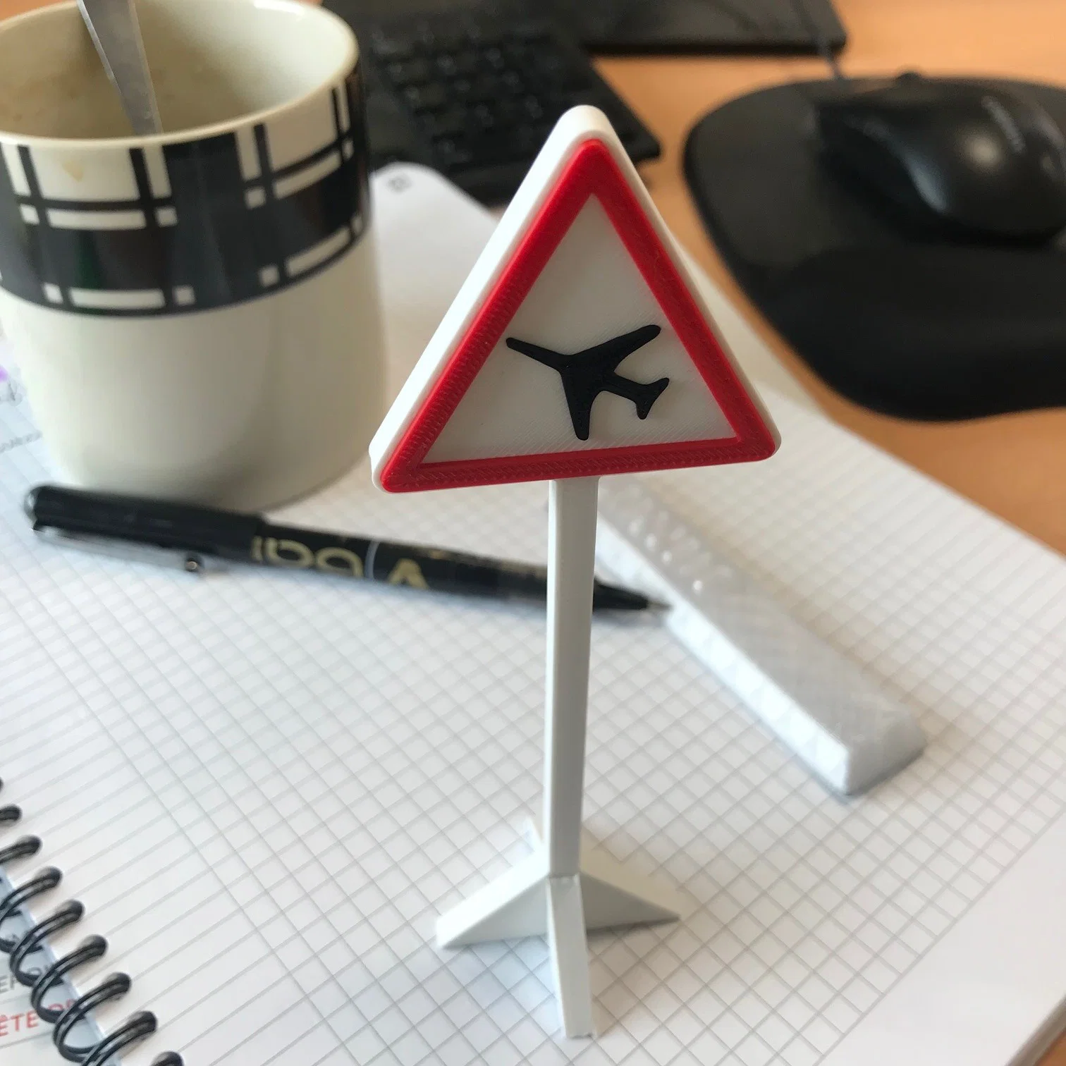 Mô hình biển báo chú ý máy bay nhỏ gọn, đi kèm chân đế để đặt đứng trang trí trong mô hình Playmobil. Biển báo này thường được dùng để cảnh báo khu vực sân bay hoặc sân bay nhỏ ở gần đó. Phần chân đế được thiết kế rất dễ lắp ráp nhờ phần rãnh khớp được làm rộng hơn một chút so với chân của biển báo.