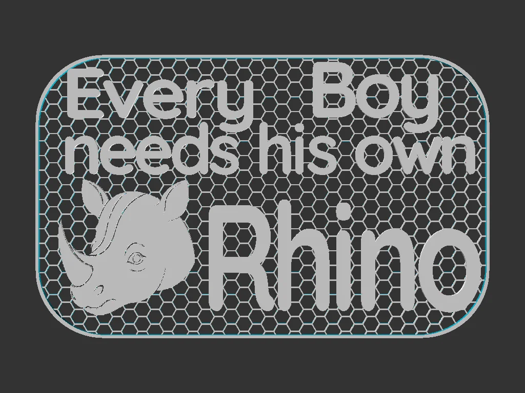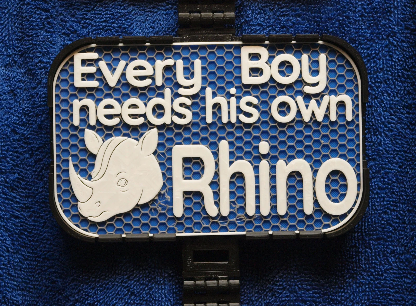 Bảng hiệu kích thước 100x160mm, với dòng chữ "Every Boy needs his own Rhino" (Mỗi cậu bé đều cần một chú tê giác cho riêng mình).