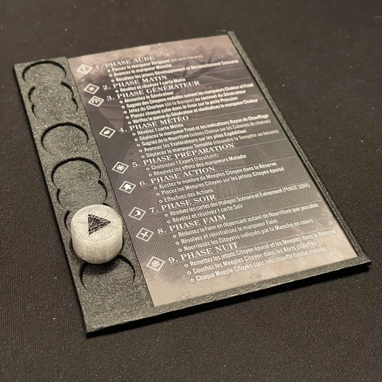 Phụ kiện khung giữ thẻ Round và điểm đánh dấu cho boardgame Frostpunk (phiên bản tiếng Pháp). Tối ưu để in với nhựa PLA, không cần support, giúp quản lý các giai đoạn trò chơi gọn gàng hơn trên bàn chơi.