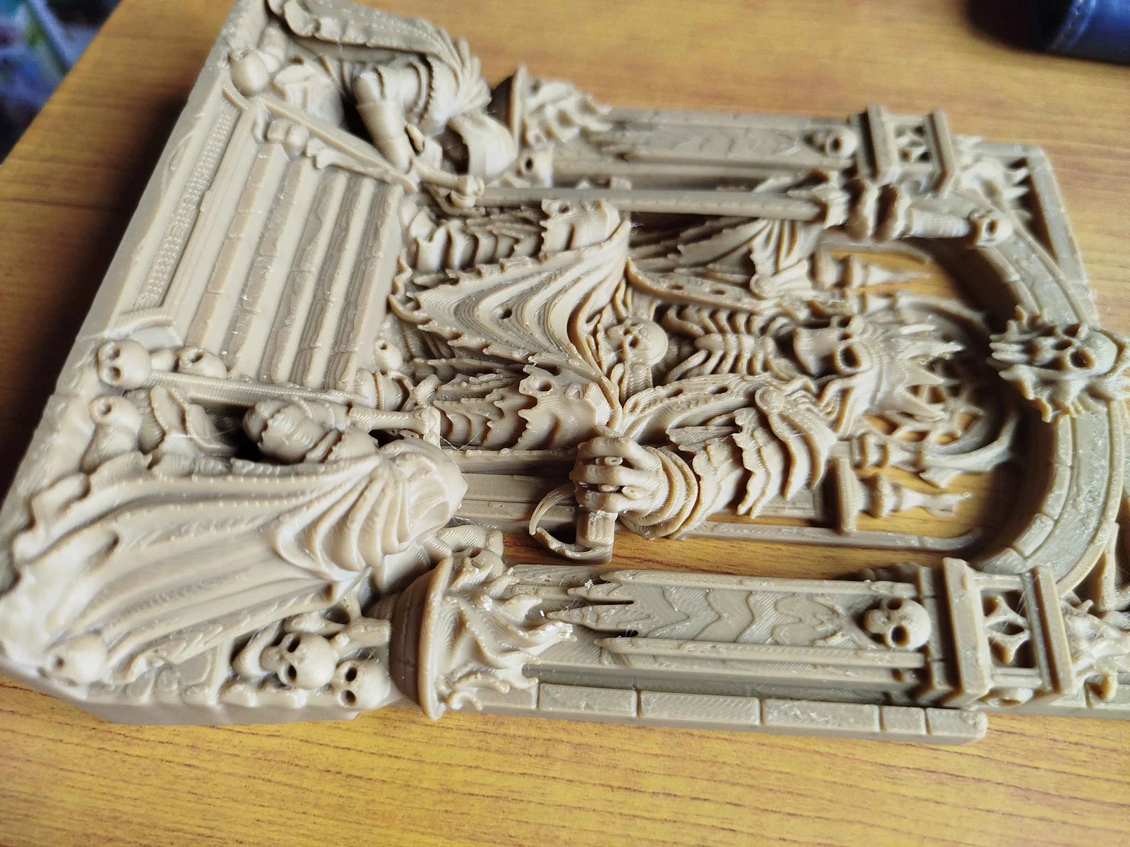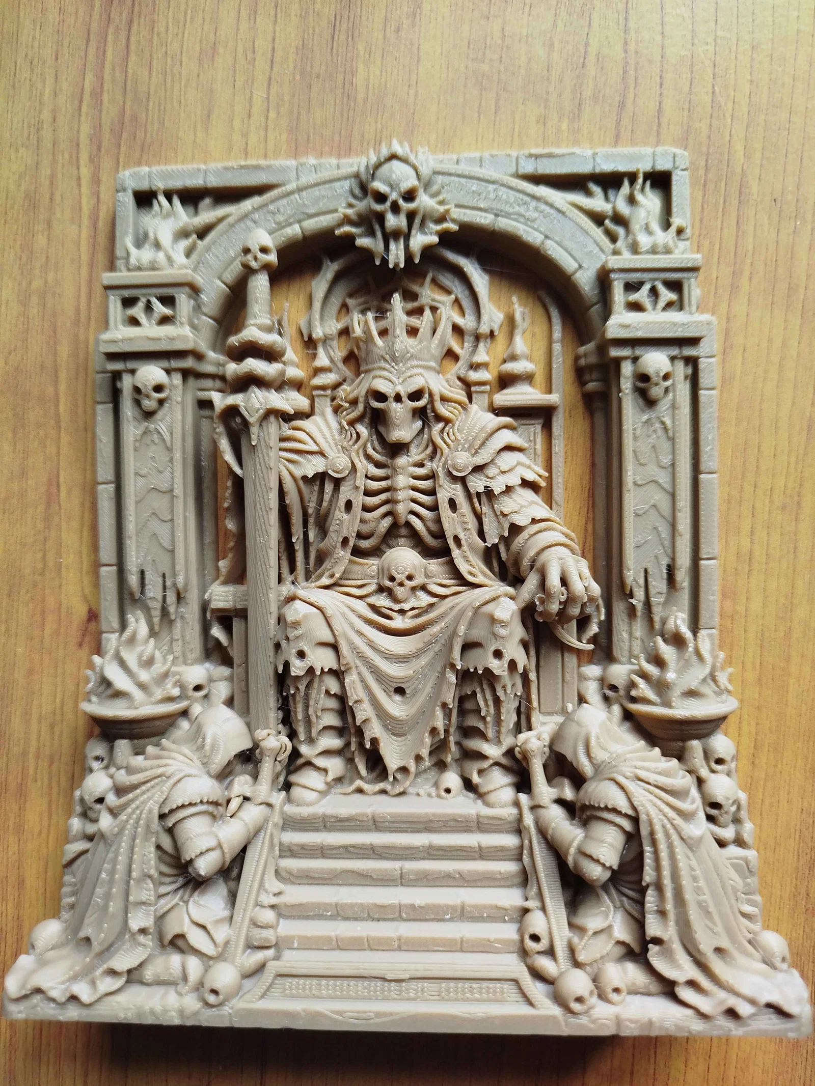 🔥 UNDERWORLD THRONE – BAS-RELIEF DÀNH CHO MÁY IN FDM Mang sức mạnh của cõi âm về ngay bàn in của bạn. Mô hình bas-relief (phù điêu) cực kỳ chi tiết này khắc họa một vị chúa tể bóng tối đang ngự trên ngai vàng hùng vĩ, bao quanh bởi các chiến binh đã ngã xuống, đầu lâu và kiến trúc cổ xưa. Được thiết kế chuyên biệt cho công nghệ in FDM, mô hình này cân bằng hoàn hảo giữa độ chi tiết hình ảnh cao và tính thực tiễn khi in.
