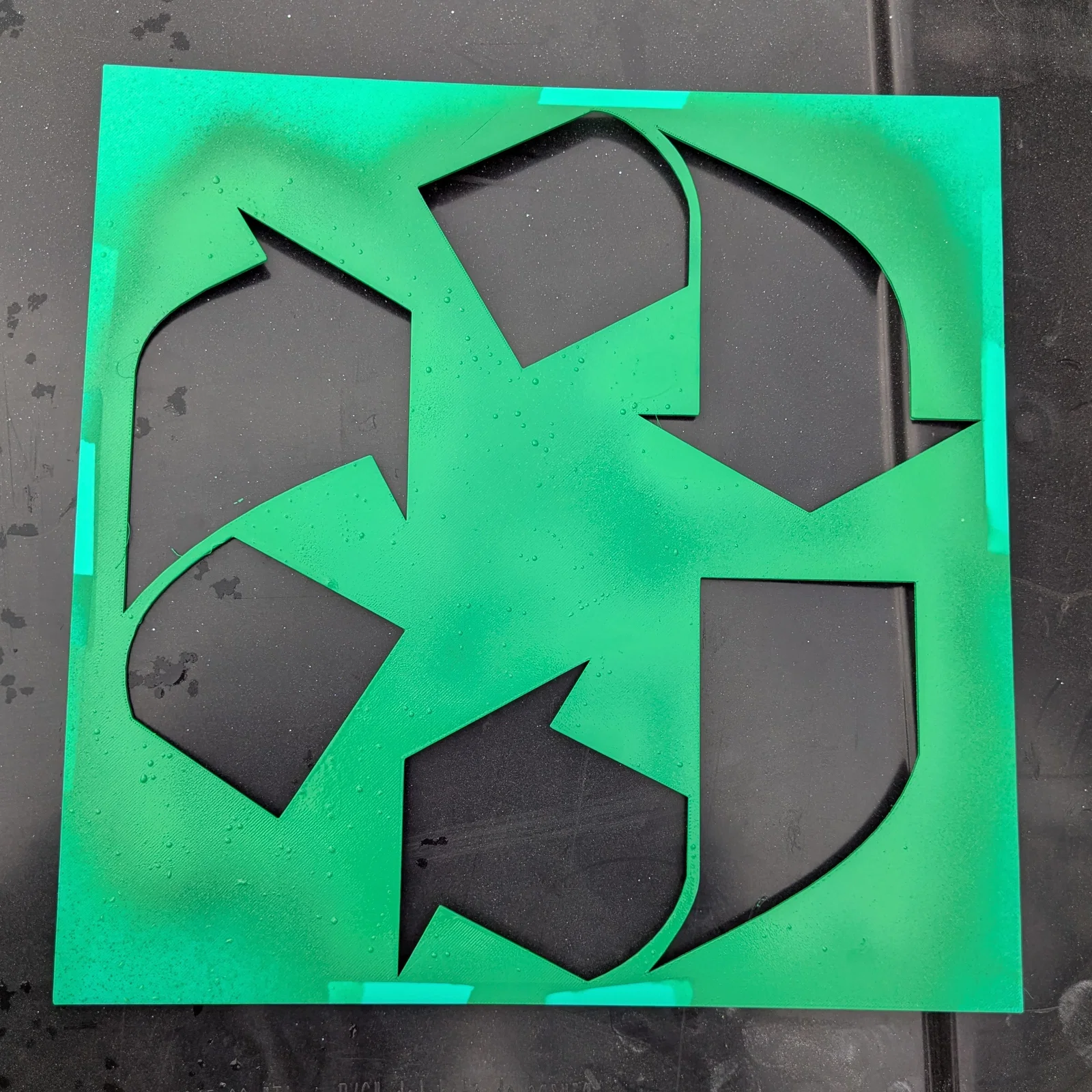 Đây là một miếng stencil đơn giản dùng để sơn logo tái chế lên thùng rác. Kích thước hình vuông 300mm (11.81") x dày 1/16".